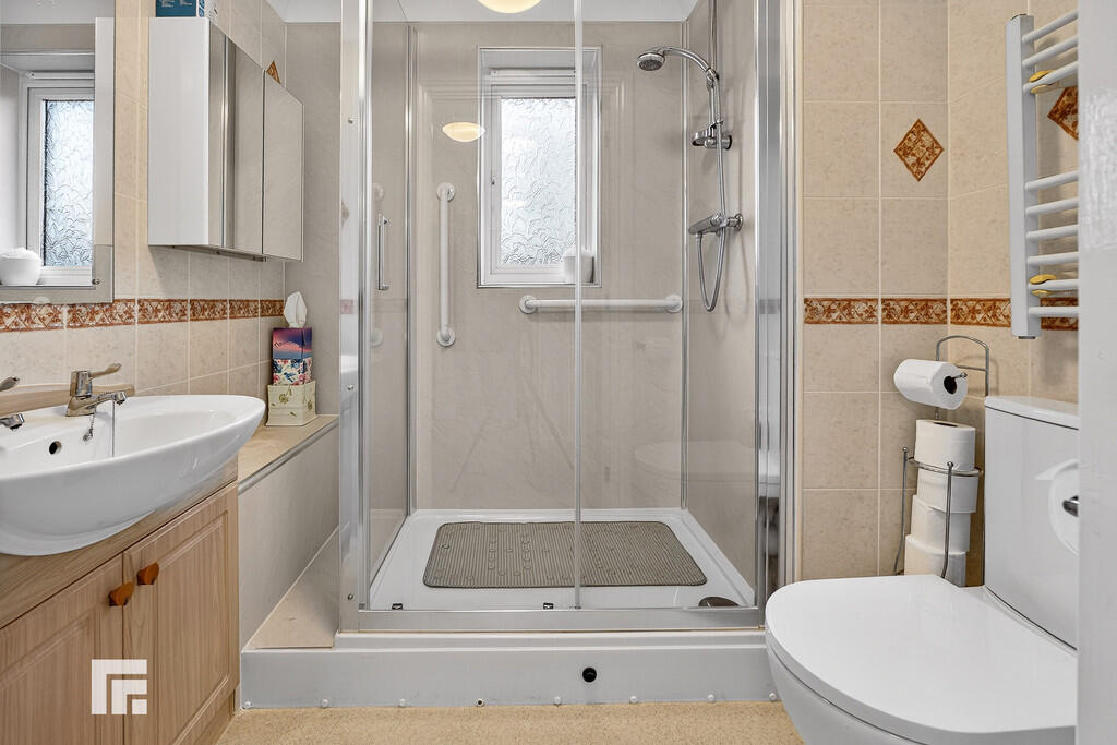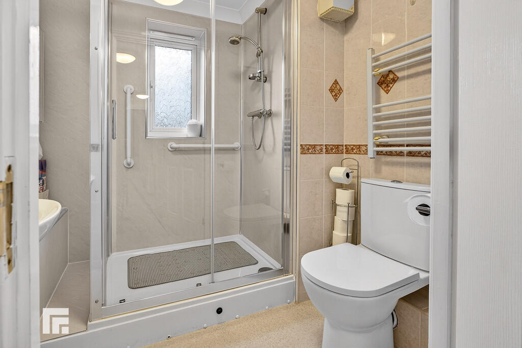 SHOWERROOM6' 9" x 5' 5" (2.07m x 1.67m) Comprising low level wc, vanity wash basin with storage below, double width shower cubicle with chrome shower, wall tiling and acrylic panel splashbacks, electric towel heater, eye level hot air heater and obscure glass window to side.