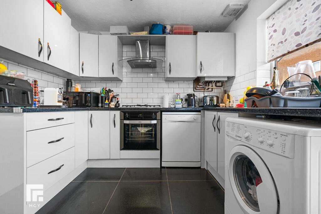 KITCHEN12' 7" x 9' 6" (3.86m x 2.90m) Tiled flooring. Modern fitted kitchen with a range of wall, base and drawer units with worktops over. Ample storage. Inset stainless steel sink and drainer with mixer tap over. Five ring gas hob with electric oven beneath and extractor hood over. Tiled splashback. Space for washing machine, dishwasher and fridge/freezer. Storage cupboard housing Combi-boiler. Space for dining table and chairs. Power points. Radiator. Pendant light fitting. Double glazed windows to rear aspect. Double glazed door leading to rear garden.
