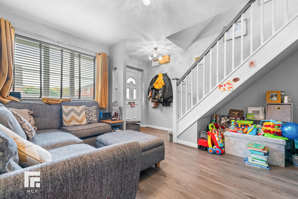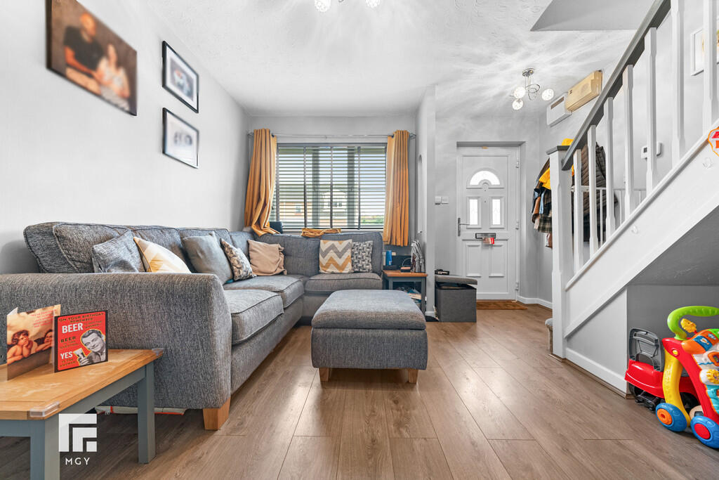 LOUNGE13' 5" x 12' 7" (4.11m x 3.86m) Front door leading straight into lounge area. Security alarm system. Laminate wood effect flooring. Under stair storage area. Pendant light fitting. TV and telephone point. Radiator. Double glazed windows to front aspect. Power points. Door leading to kitchen. Carpeted stairs rising to first floor.