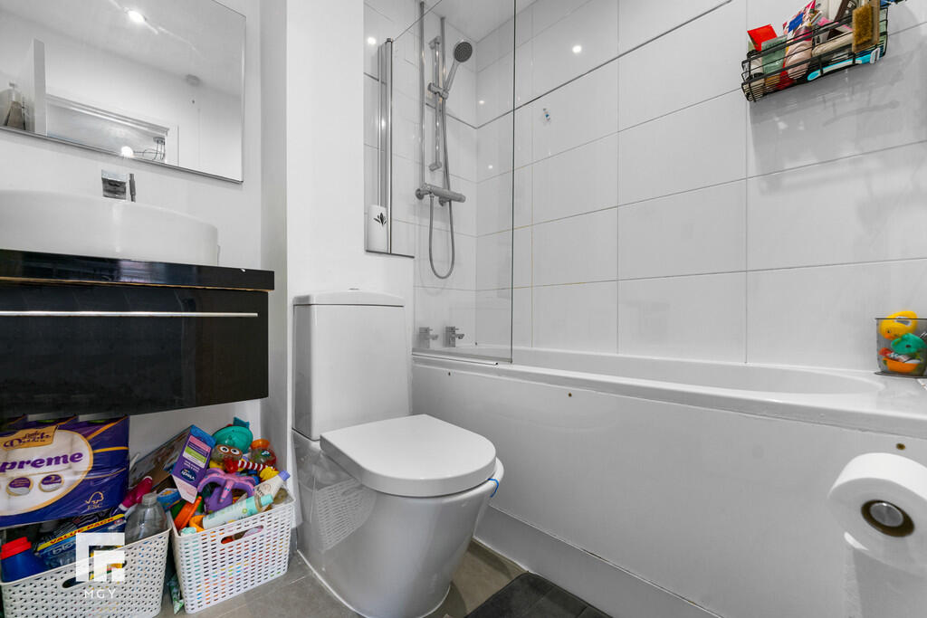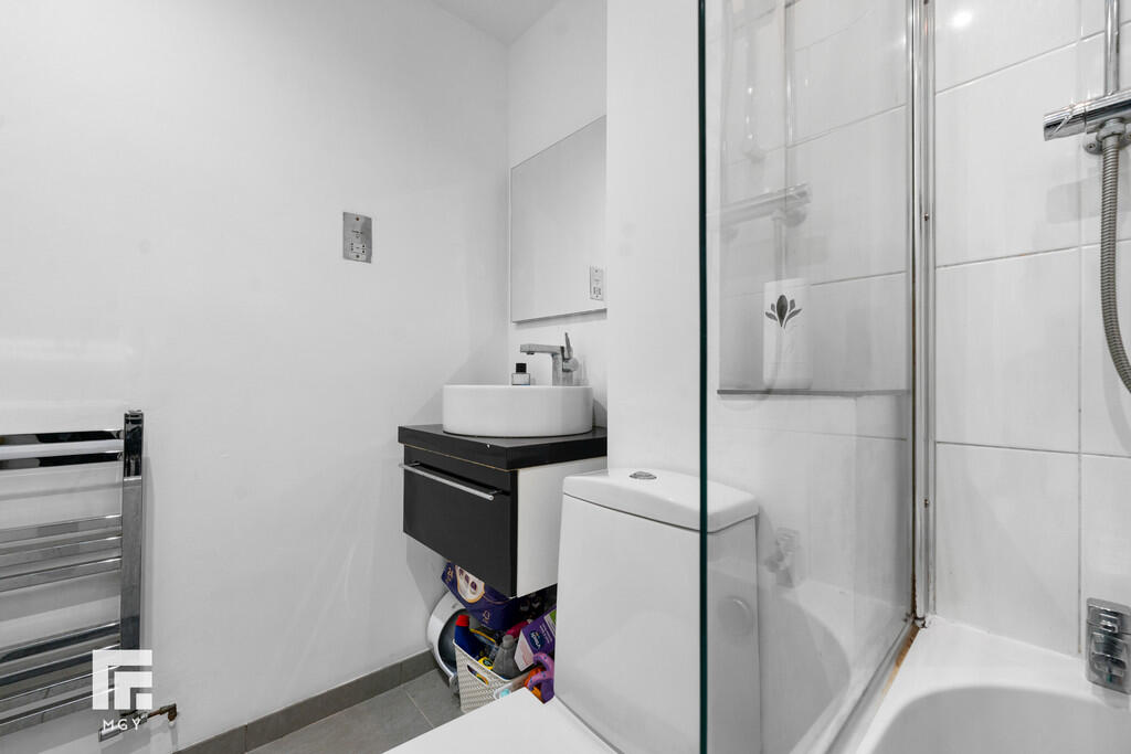 BATHROOM Modern bathroom. Tiled flooring and partially tiled walls. White three piece suite comprising W.C, vanity wash hand basin with mixer tap over and storage beneath, panelled bath with hot and cold tap over and mains powered shower above. Glass shower screen. Shaver point. Pendant light fitting. Extractor fan. Heated towel rail. Spotlights.