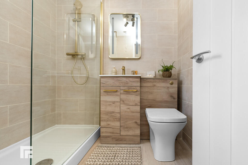 FAMILYSHOWERROOM Newly fitted, modern suite comprisng low level wc, vanity wash basin with storage below, walk in shower cubicle with glass screen and gold twin head shower above. Full wall tiling. Tiled flooring. Obscured glass window to front. Heated towel rail.