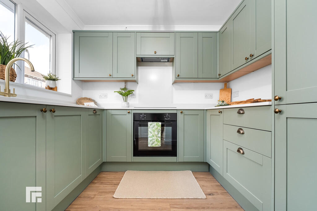 KITCHEN8' 5" x 7' 5" (2.59m x 2.28m) A newly fitted and beautifully presented kitchen, well appointed along three sides in green matte finish fronts beneath quartz worktop surfaces. Inset acrylic sink with monoblock mixer tap. Inset four ring hob with concealed cooker hood above and oven below. Integrated fridge freezer. Integrated slim line dishwasher. Integrated washing machine. Matching range of eye level wall cupboards. Match quartz upstand to worktop area and splash back behind hob. Window to front. Laminate flooring.