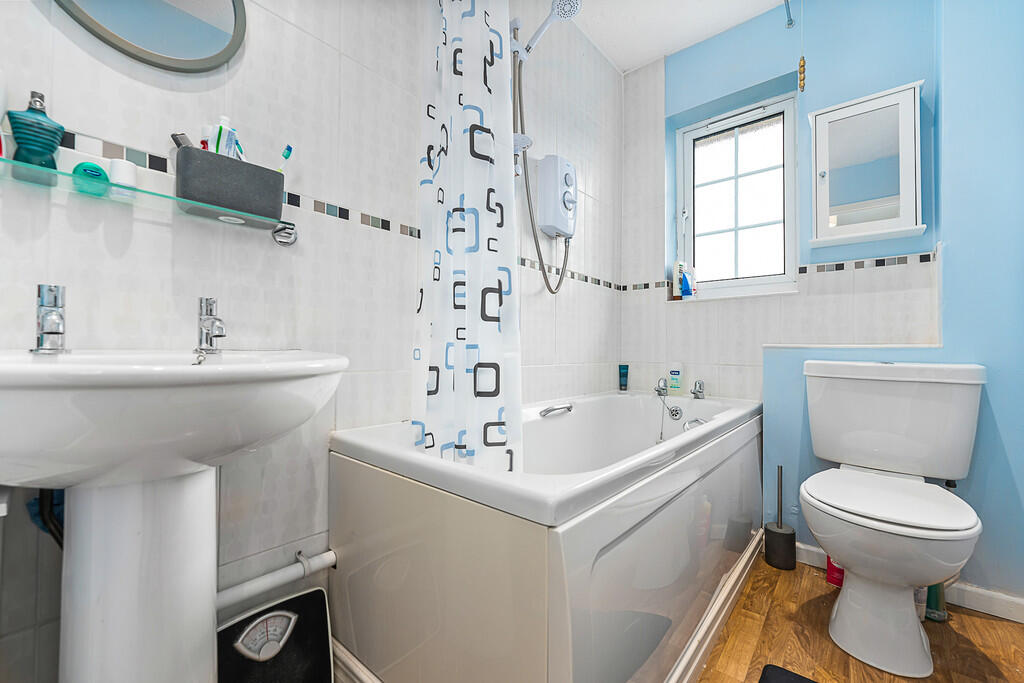 BATHROOM7' 11" x 4' 9" (2.42m x 1.47m) Obscured double glazed window to front. Panelled bath with hot and cold taps and electric shower over, w.c, pedestal wash hand basin with hot and cold taps. Wood effect vinyl flooring. Part tiled walls.