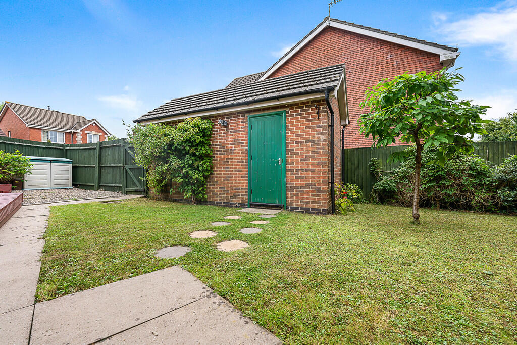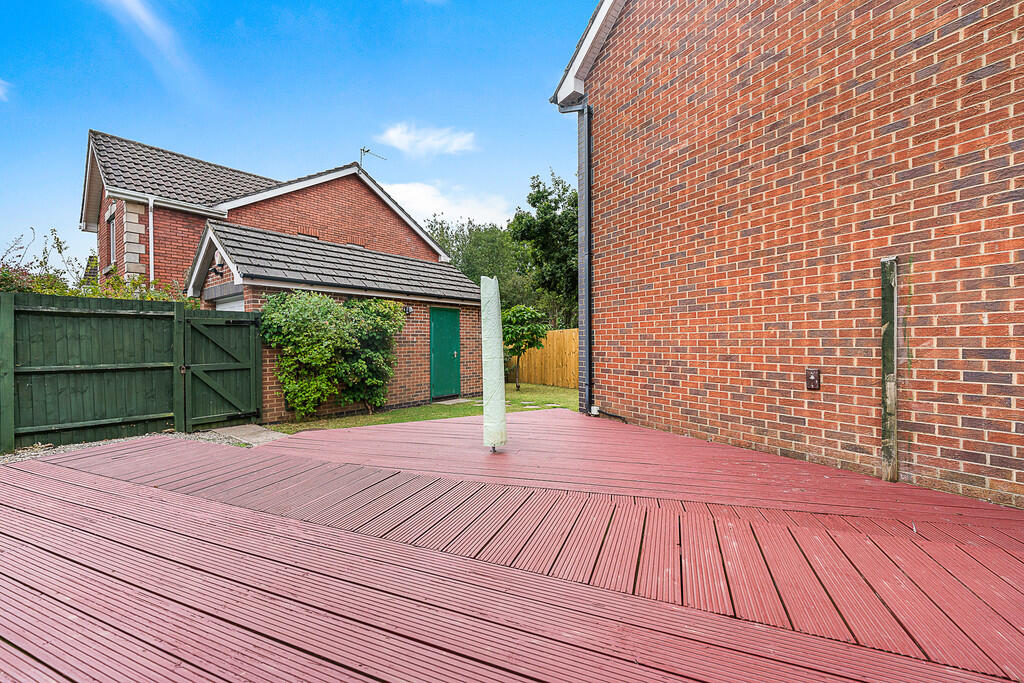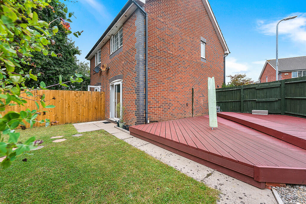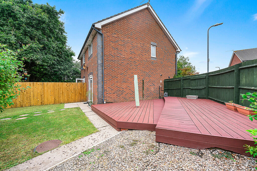 OUTSIDE A generous garden to rear and side, part paved, lawn with stepping stones leading to pedestrian garage door. Decked area. Outside tap. Gate to rear leading to driveway and Garage.
