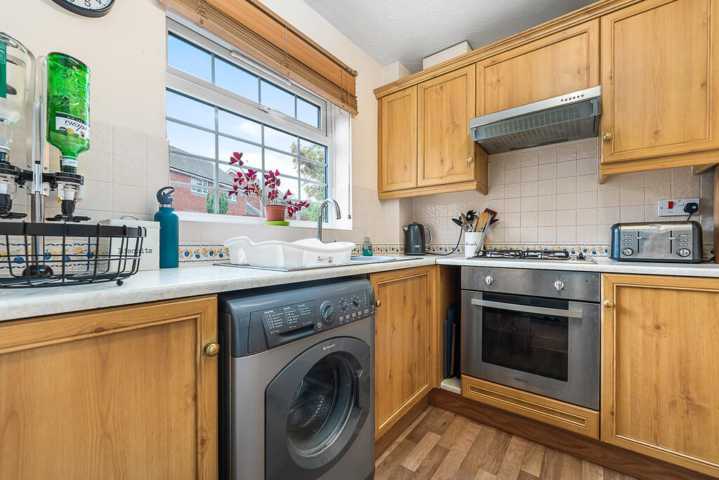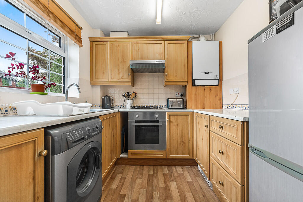 KITCHEN7' 4" x 7' 9" (2.25m x 2.38m) Double glazed uPVC window to front. Textured ceiling. Wood effect vinyl flooring. Base and wall units with work surfaces and tiled splash backs incorporating one and a half stainless steel sink unit with mixer tap. Built in oven, 4 ring gas hob and extractor over. Recess for fridge / freezer. Plumbing and space for washing machine. Wall mounted "Baxi" combi boiler.