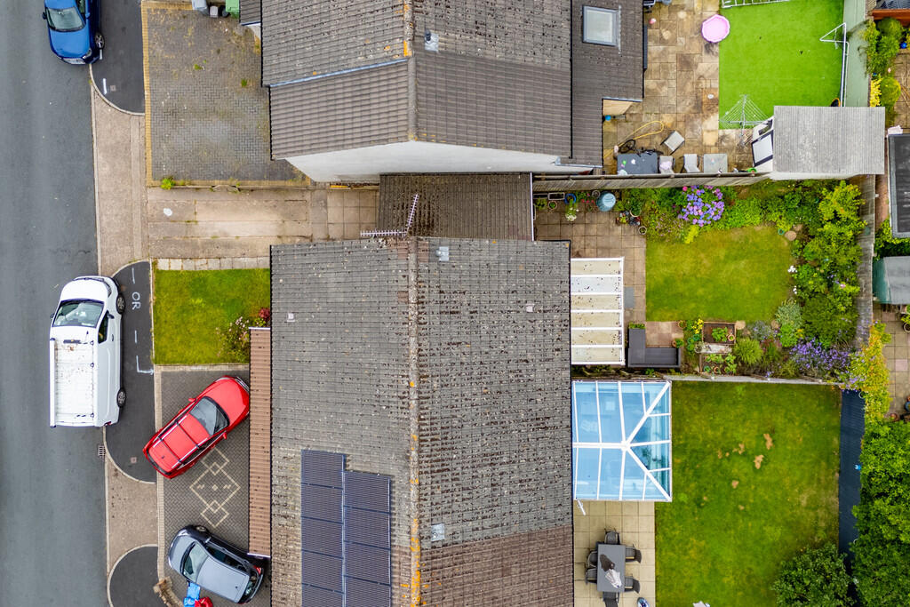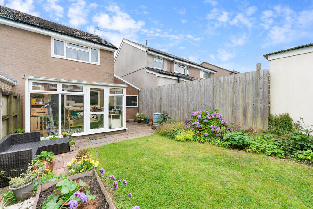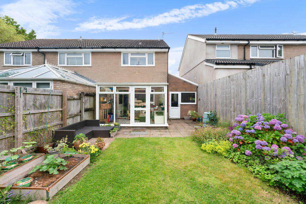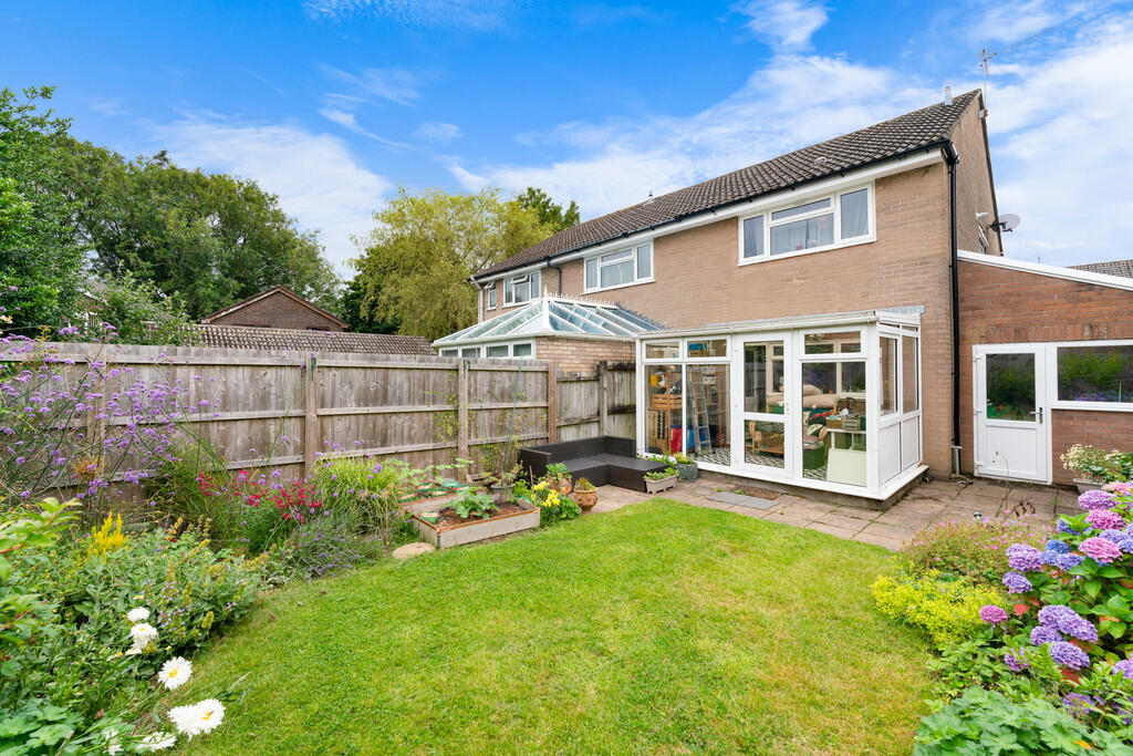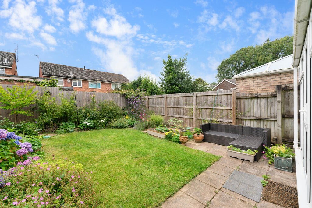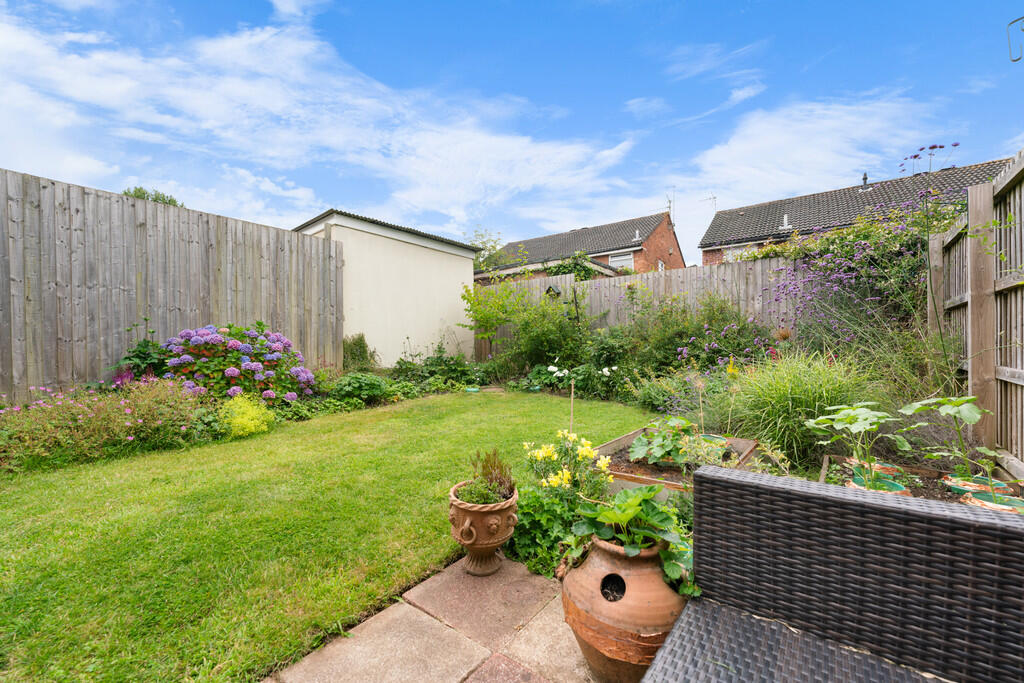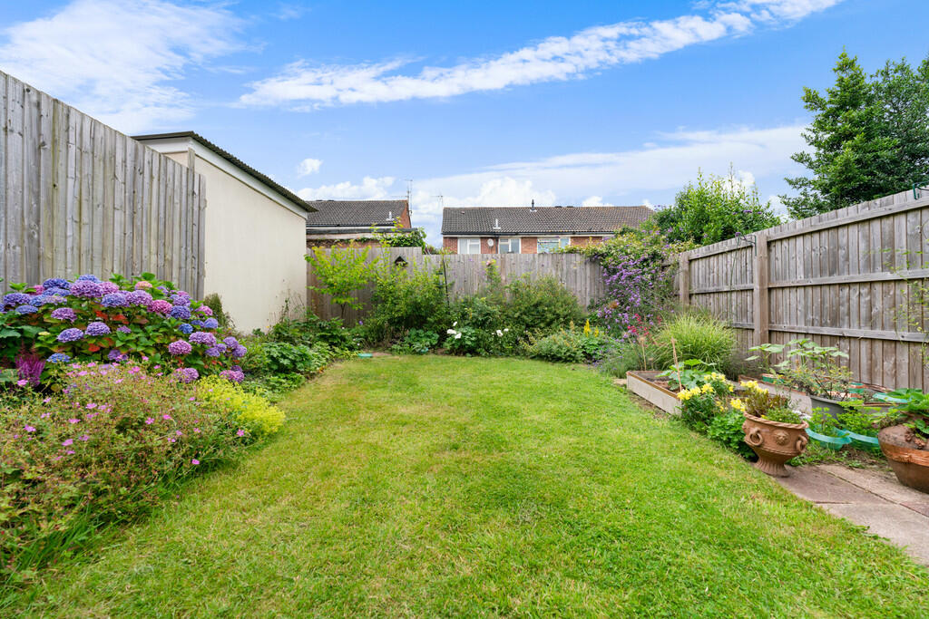 REARGARDEN A beautifully presented westerly facing rear garden with paved patio and shaped lawn. Delightful neat borders of plants and shrubs with raised fruit and veg planters. Enclosed by timber lap fencing.