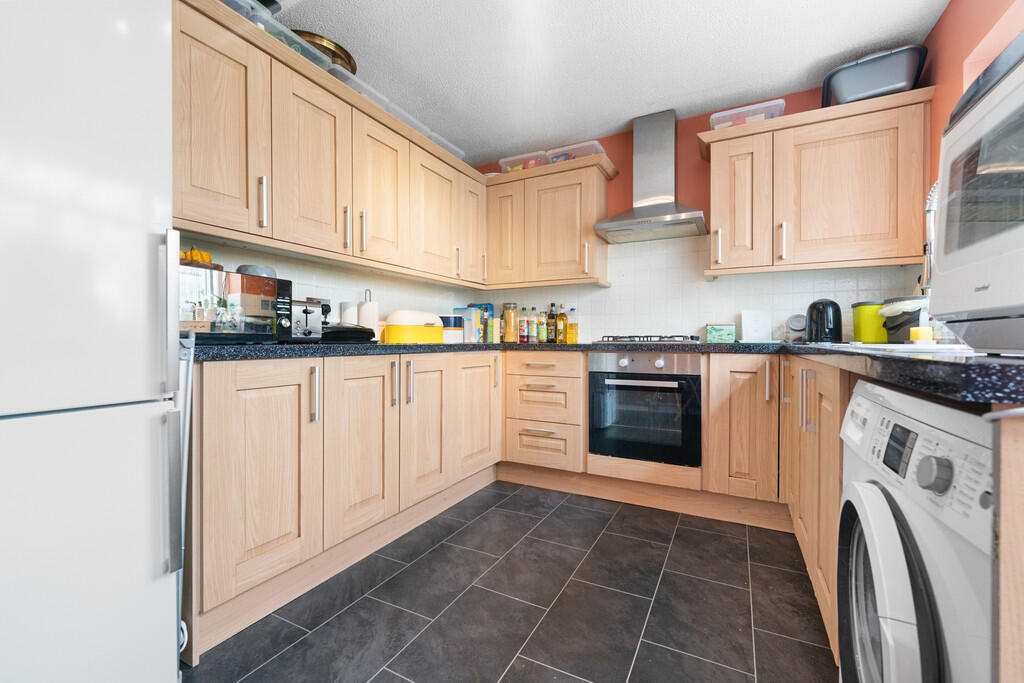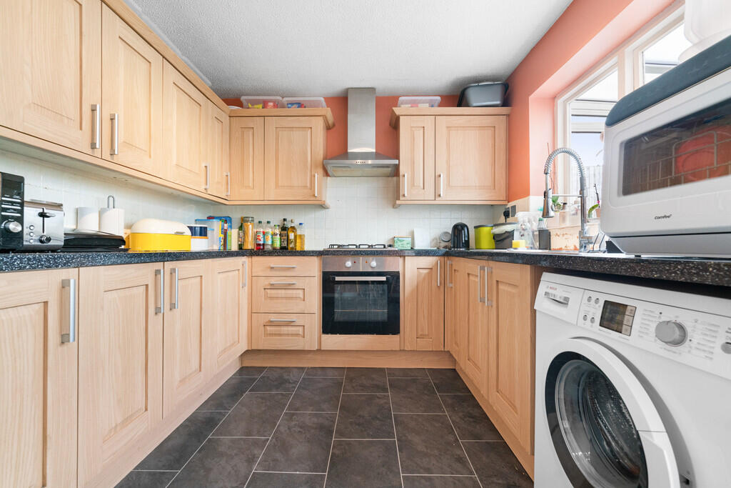 KITCHEN/BREAKFASTROOM12' 9" x 8' 11" (3.91m x 2.72m) Modern fitted kitchen well appointed along three sides with woodgrain finish fronts beneath laminate worktop surfaces. Inset 1.5 bowl stainless steel sink with side drainer. Inset 4 ring gas hob with cooker hood above and oven below. Matching range of eye level wall cupboards. Plumbing for washing machine. Space for fridge freezer. Tiled splash back. Door and window to conservatory. Space for breakfast table. Chrome heated towel rail.
