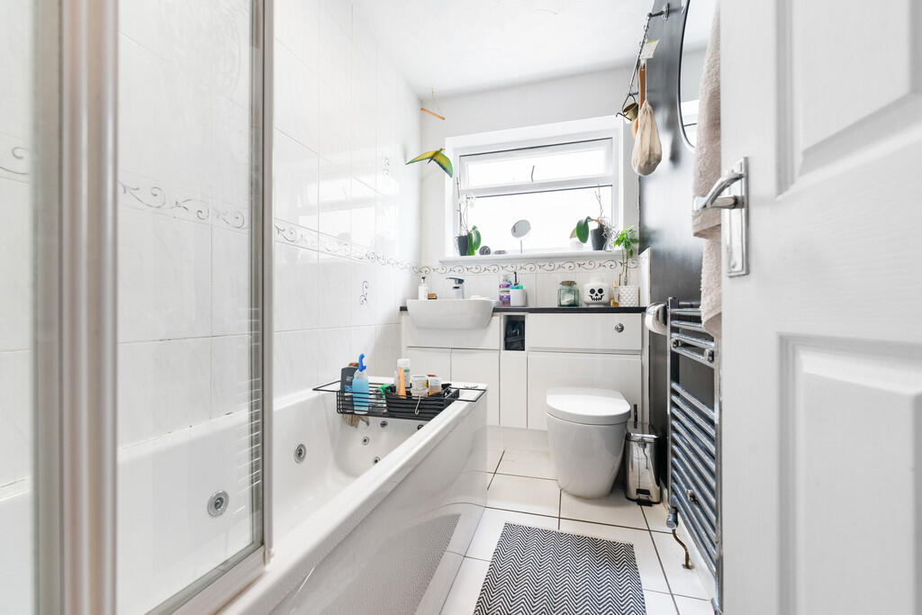 FAMILYBATHROOM8' 5" x 4' 8" (2.57m x 1.43m) Modern white suite comprising low level wc, vanity wash basin with storage below, 'Jacuzzi' style bath with 'Triton' shower above. Tiled splash back. Tiled flooring. Obscured glass window to side. Chrome heated towel rail. Extractor fan.