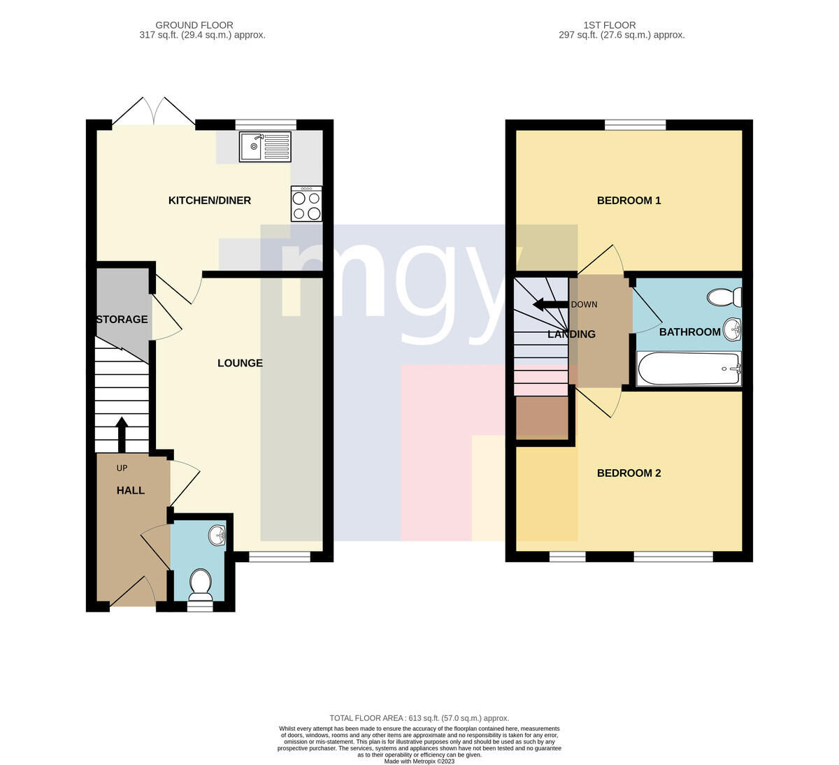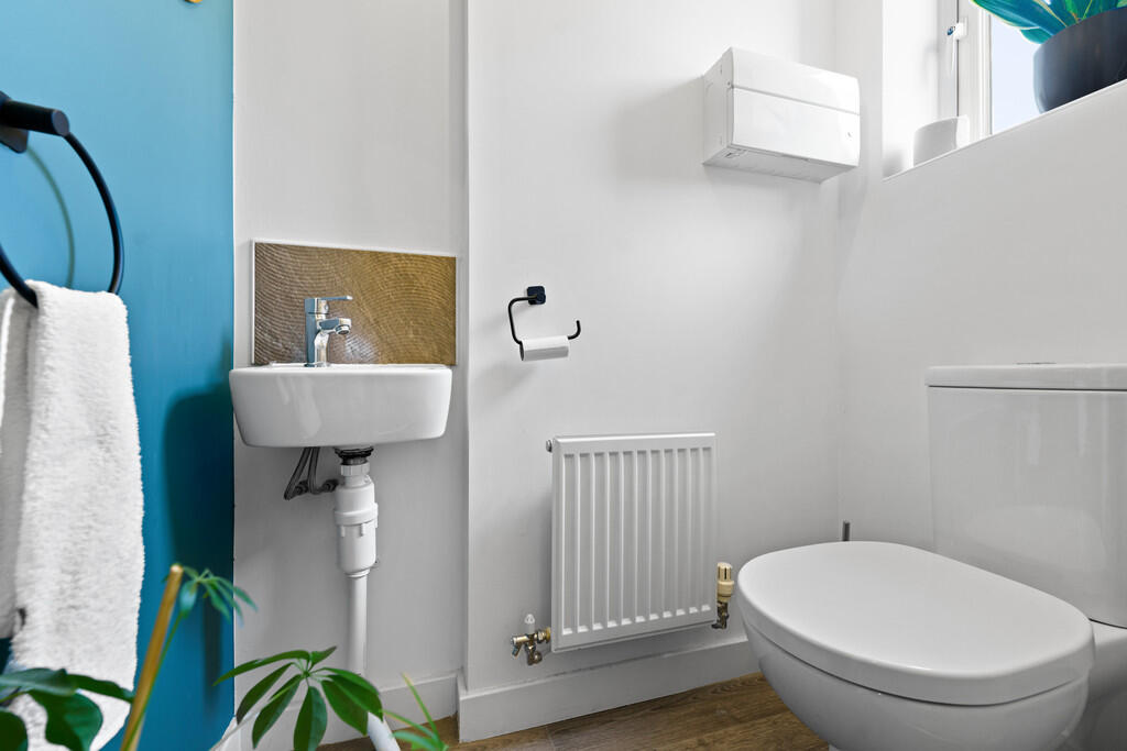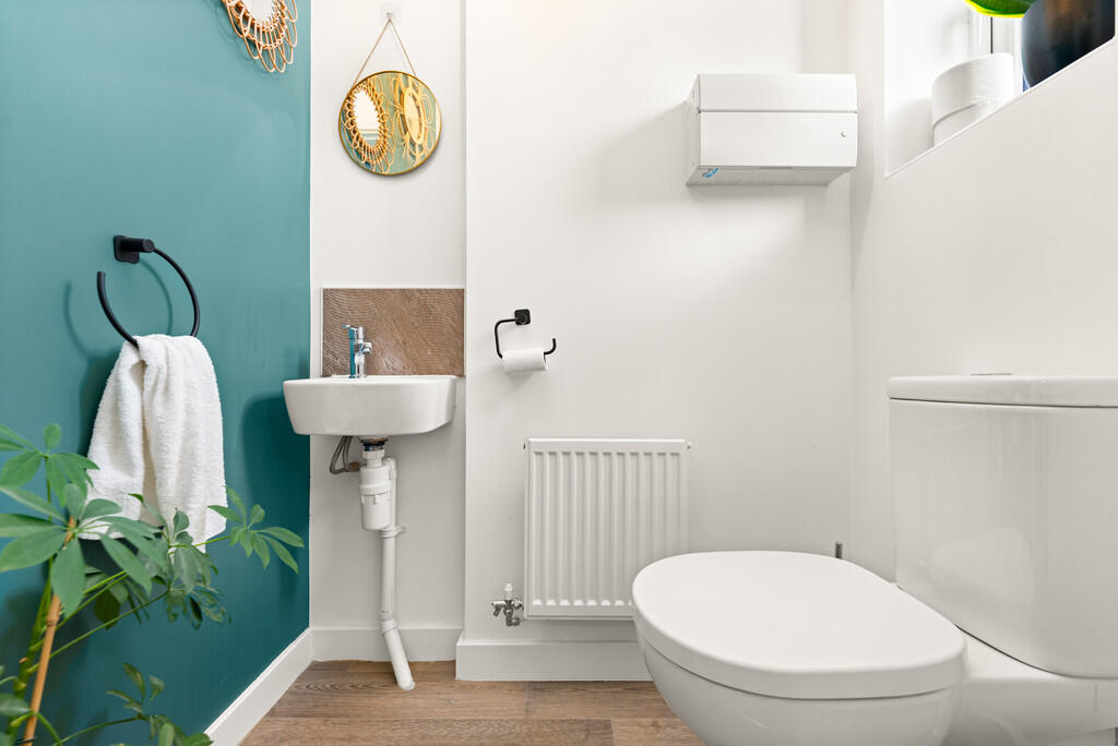 CLOAKROOM White suite comprising low level wc, wash hand basin, tiled splash back, obscure glass window to front. Radiator.