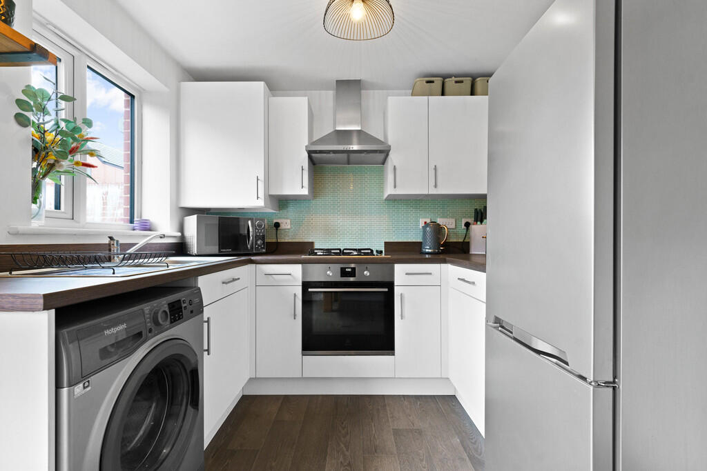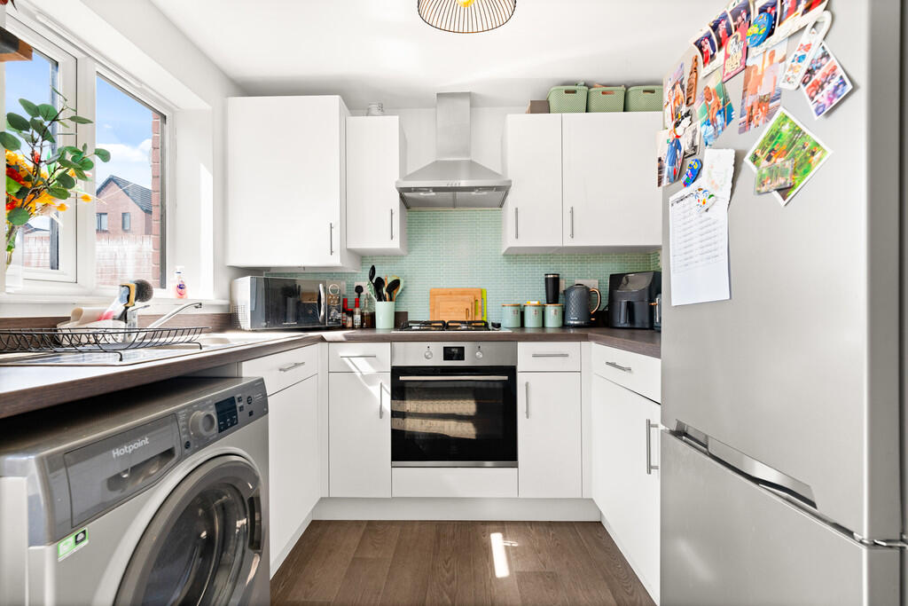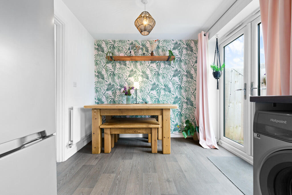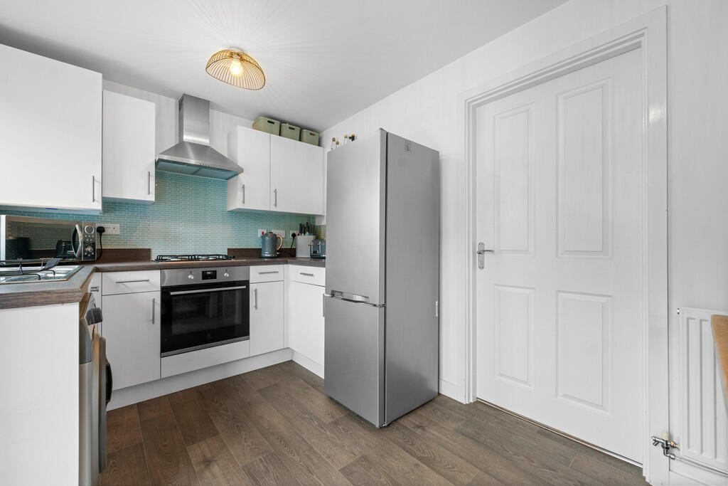 KITCHENANDDININGROOM12' 9" x 8' 0" (3.89m x 2.46m) Modern fitted kitchen, appointed along three sides in light fronts beneath round nosed laminate worktop surfaces, inset 1.5 bowl stainless steel sink with side drainer, inset 4 ring gas hob with cooker hood above, oven below, plumbing for washing machine, space for fridge freezer, matching range of eye level wall cupboards, window to rear, concealed ideal logic combi gas central heating boiler, ample space for family dining table, radiator and french doors to rear garden.