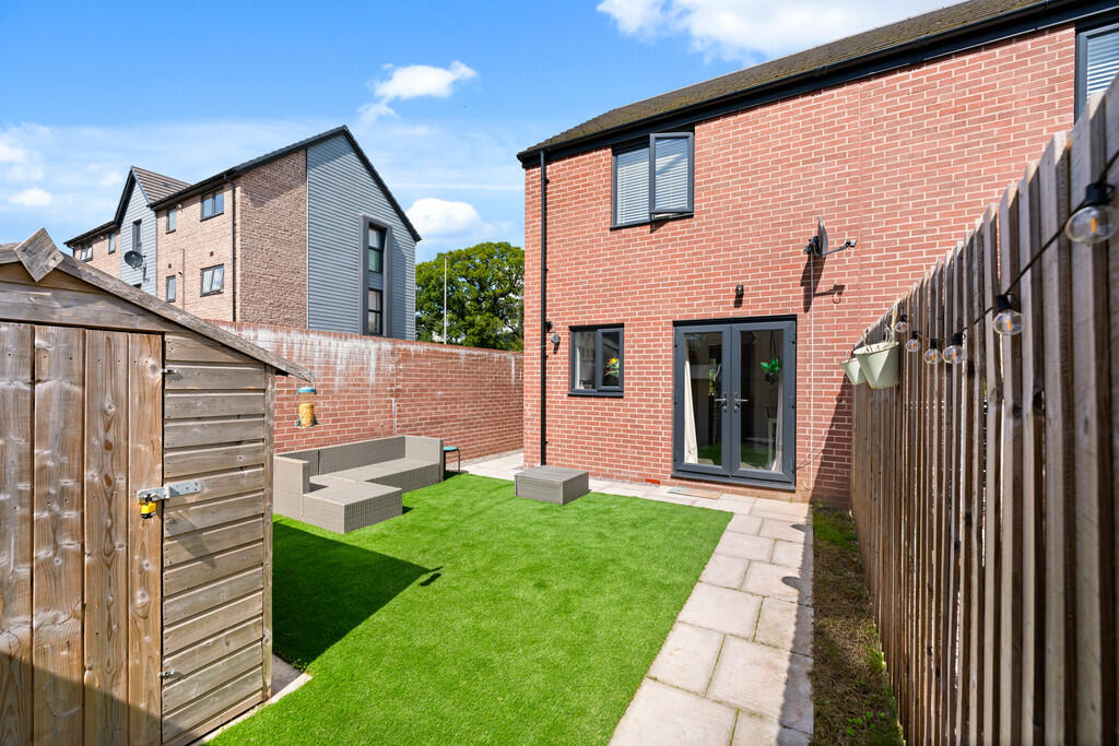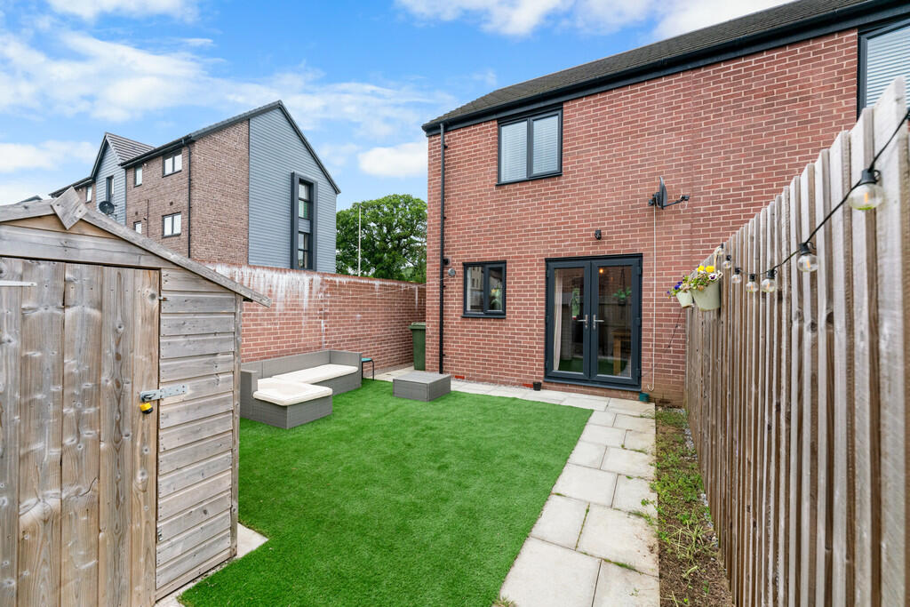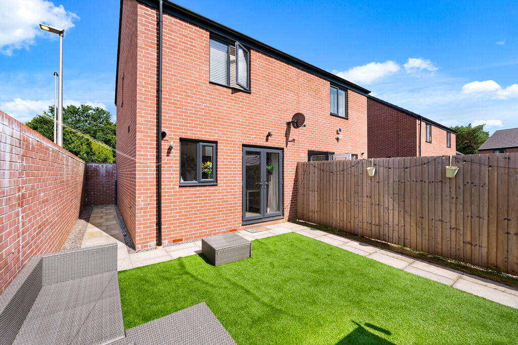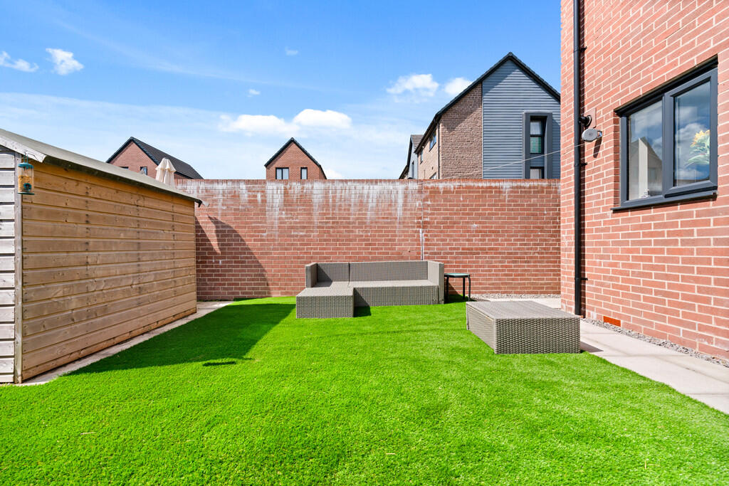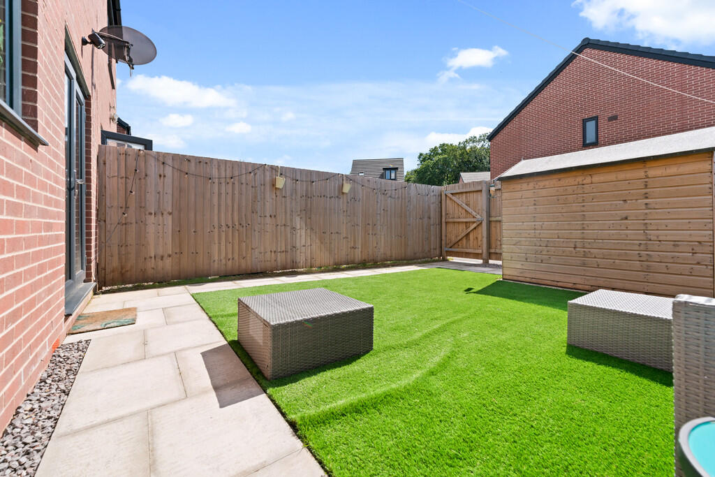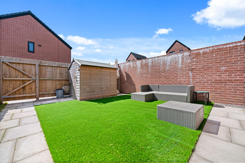REARGARDEN Enjoying a south westerly facing aspect. Comprising area of artificial lawn, paved pathways, enclosed by timber fencing and brick built wall. Timber gate leading to rear driveway.