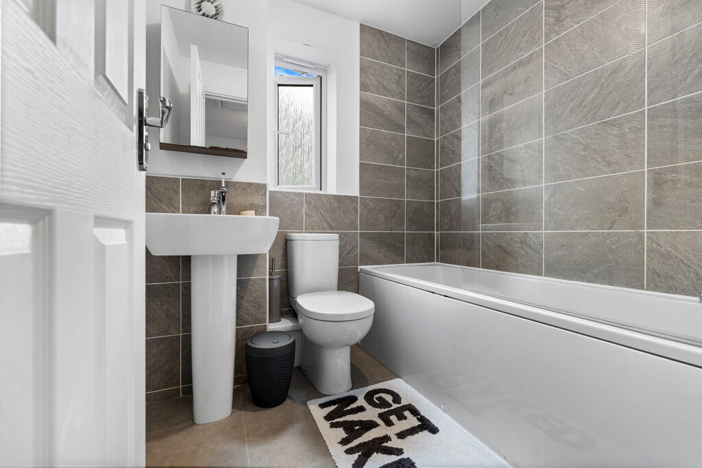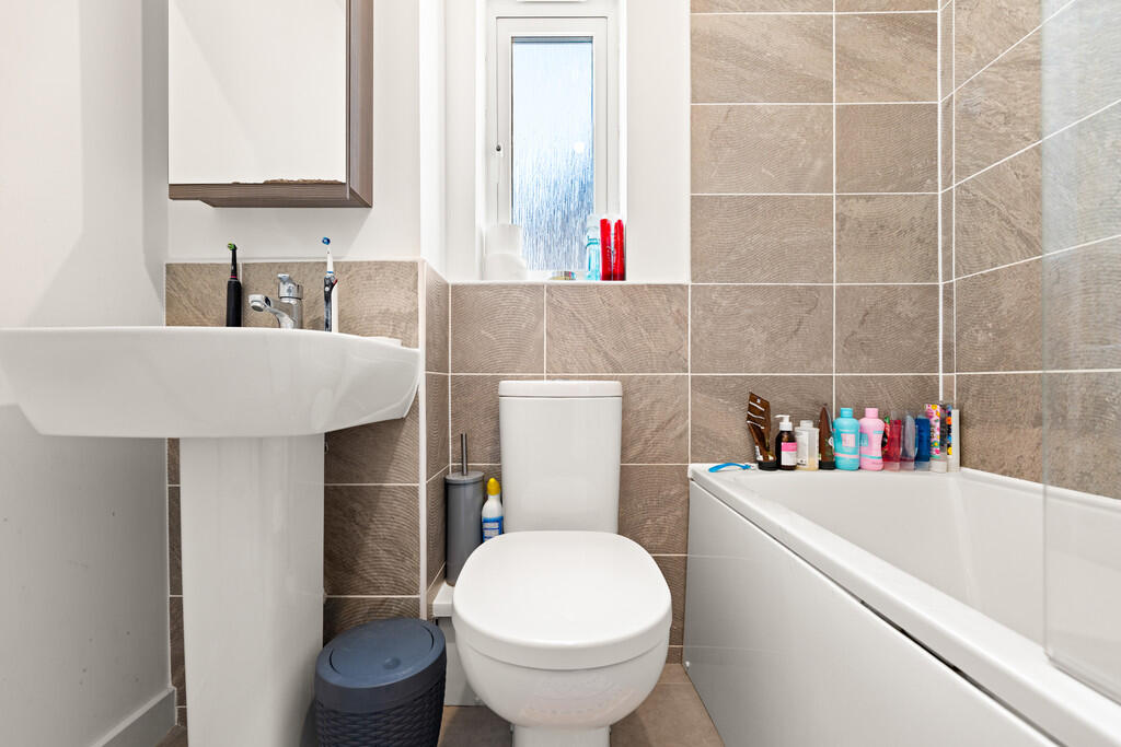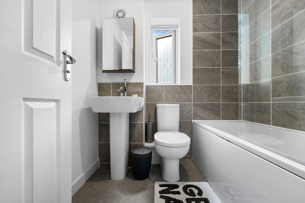 FAMILYBATHROOM6' 3" x 5' 7" (1.92m x 1.71m) Modern white suite comprising low level wc, wash hand basin, panelled bath with shower mixer tap, wall tiling to splash back areas, extractor fan, obscure glass window to side and radiator.