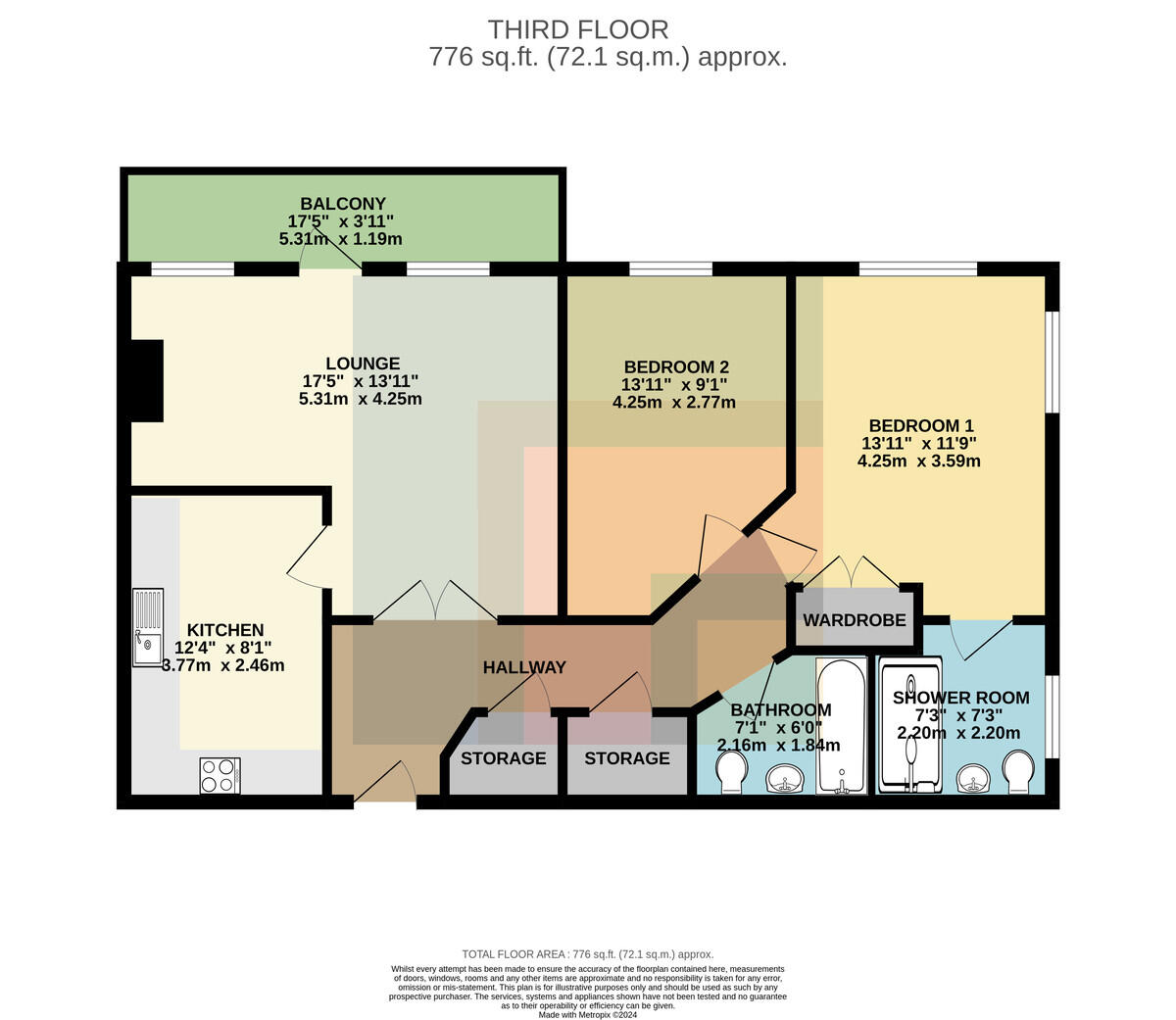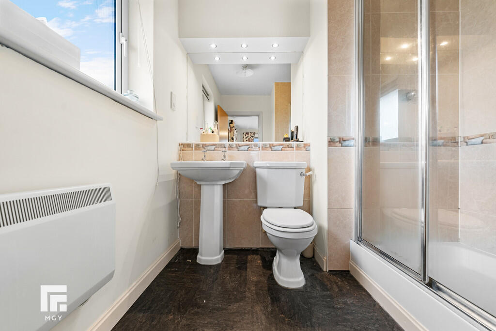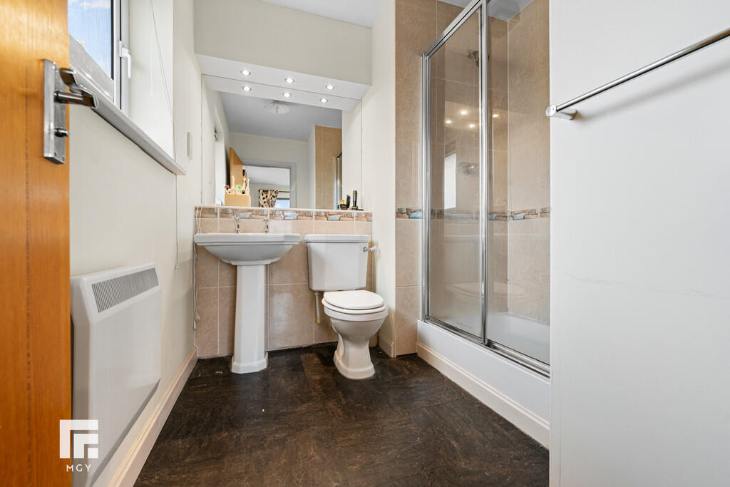 ENSUITE7' 2" x 7' 2" (2.20m x 2.20m) Double shower cubicle with tiled splashbacks and mains shower over. Pedestal wash hand basin with hot and cold taps. W.C. Wall mounted mirror with lighting over. Obscure double glazed window to side. Part tiled walls. Vinyl flooring. Electric heater. Wall mounted towel rail. Shaver point. Extractor fan.