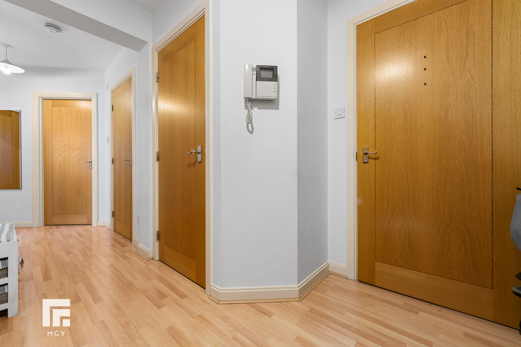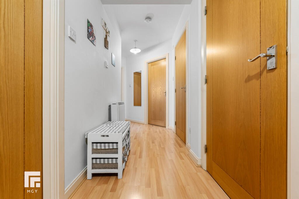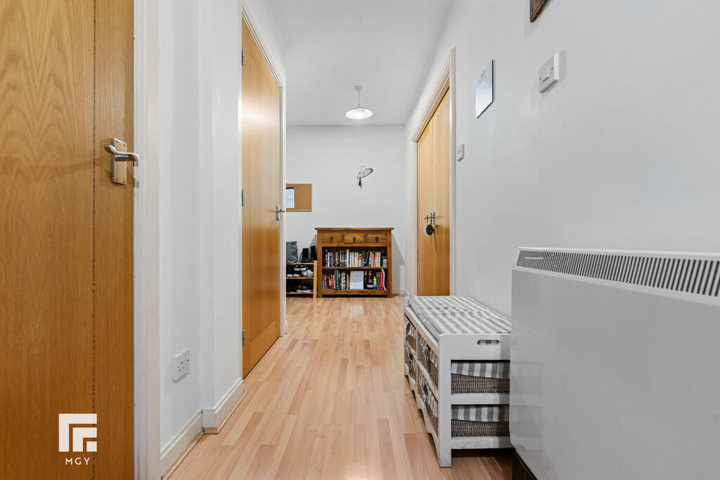 HALLWAY Entered via wooden door, with security spy hole. Spacious hallway, with video entry intercom system. Laminate wood effect flooring. Smoke alarm. Wall mounted electric panel heater. Two storage cupboards, one housing hot water tank.