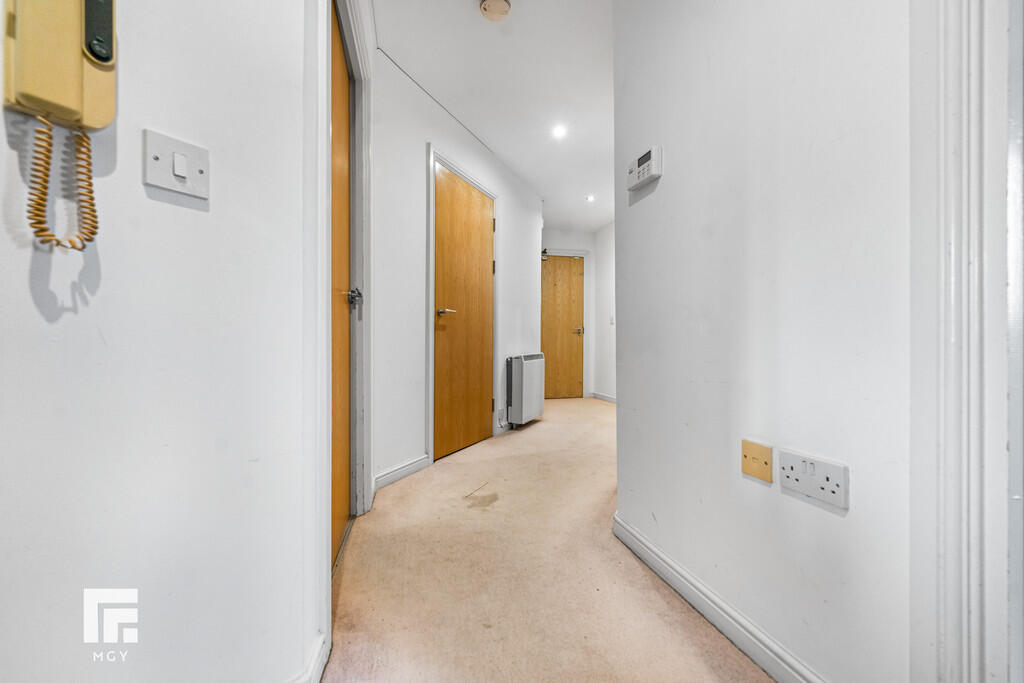 HALLWAY Entered via wooden door, with security spy hole. Spacious hallway. Carpeted flooring. Wall mounted security entry intercom system. Storage cupboard housing hot water tank. Wall mounted storage heater.