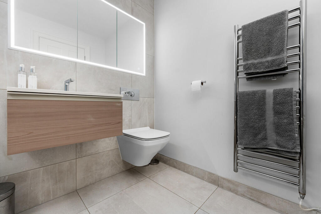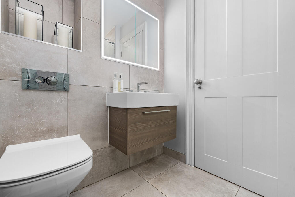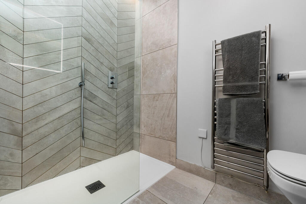 SHOWERROOM6' 10" x 5' 8" (2.10m x 1.74m) Mandarin Stone tiled flooring and tiled walls with feature tiling to shower cubicle. Under floor heating. Walk in shower with rainfall shower over and additional shower attachment. Inset storage with lighting. Vanity enclosed wash hand basin with dual tap. W.C with dual flush. Large inset mirrored vanity unit with lighting. Extractor fan. Heated towel rail. Spotlights to ceiling. Thermostat control.