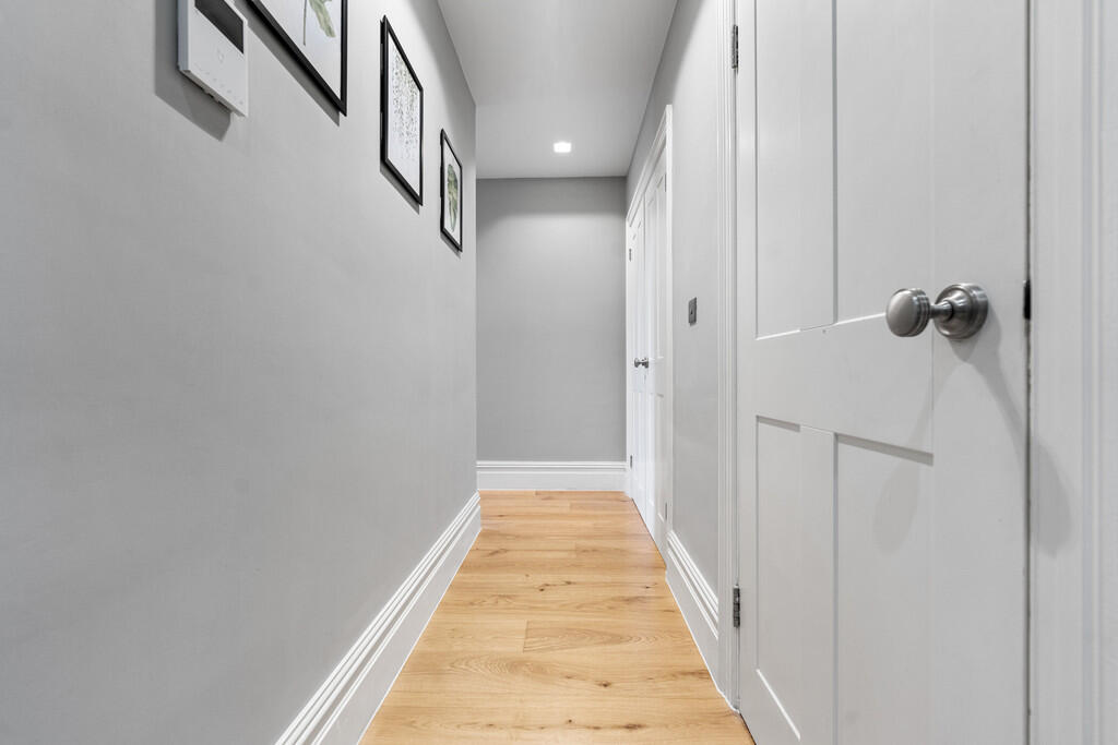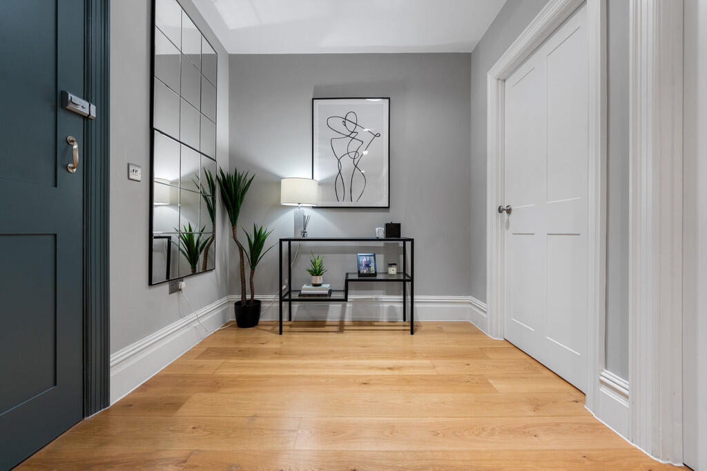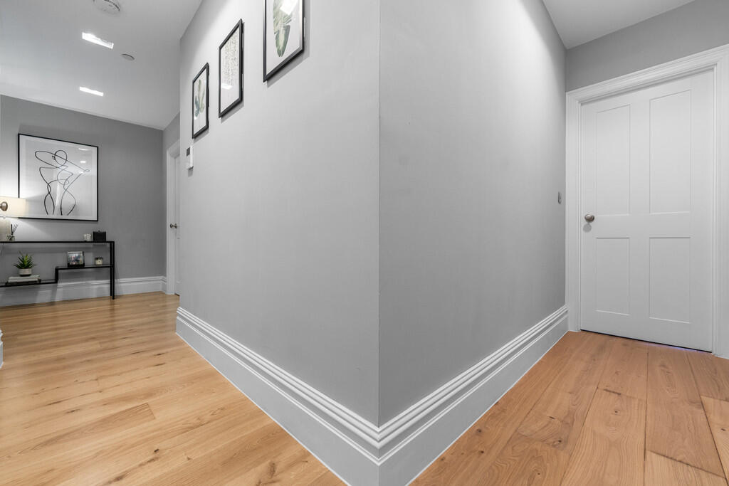 ENTRANCEHALL Entered via large wooden door. Spacious entrance hall. Engineered oak wood flooring. Wall mounted video entry intercom system with additional remote app control. Two large storage cupboards. One housing hot water tank and one with plumbing for washing machine. Spotlights to ceiling. Wall mounted electric panel heater. Doors leading to kitchen and living area, bedrooms and shower room.
