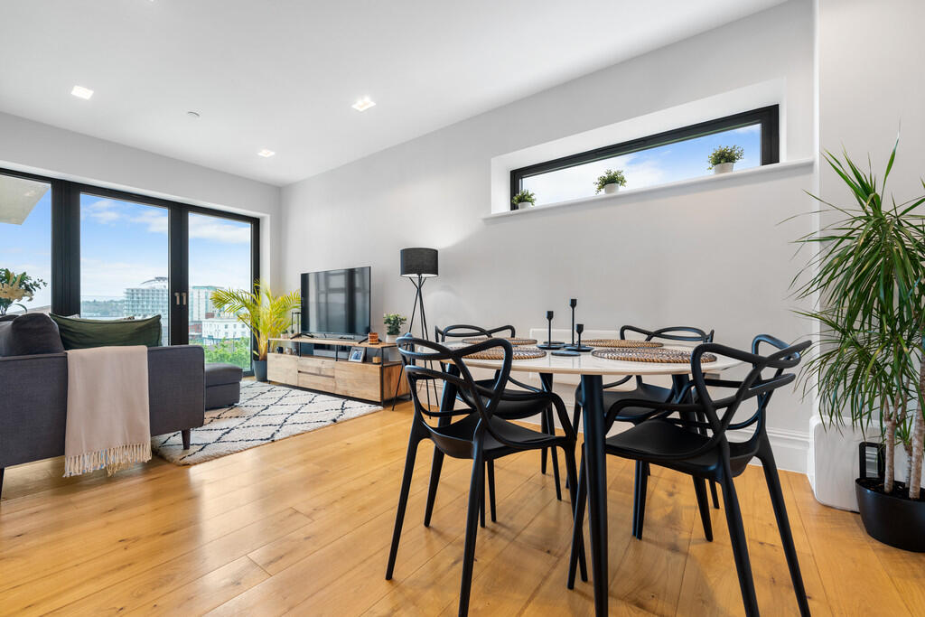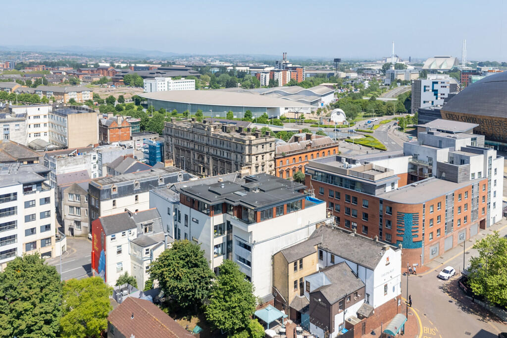 LIVINGAREA20' 6" x 9' 1" (6.27m x 2.79m) Double glazed Anthracite aluminium window and doors, leading to glass Juliette balcony. Great views across Cardiff Bay. Engineered wood flooring. Wall mounted electric panel heater. TV Aerial point. Telephone point. Spotlights to ceiling.