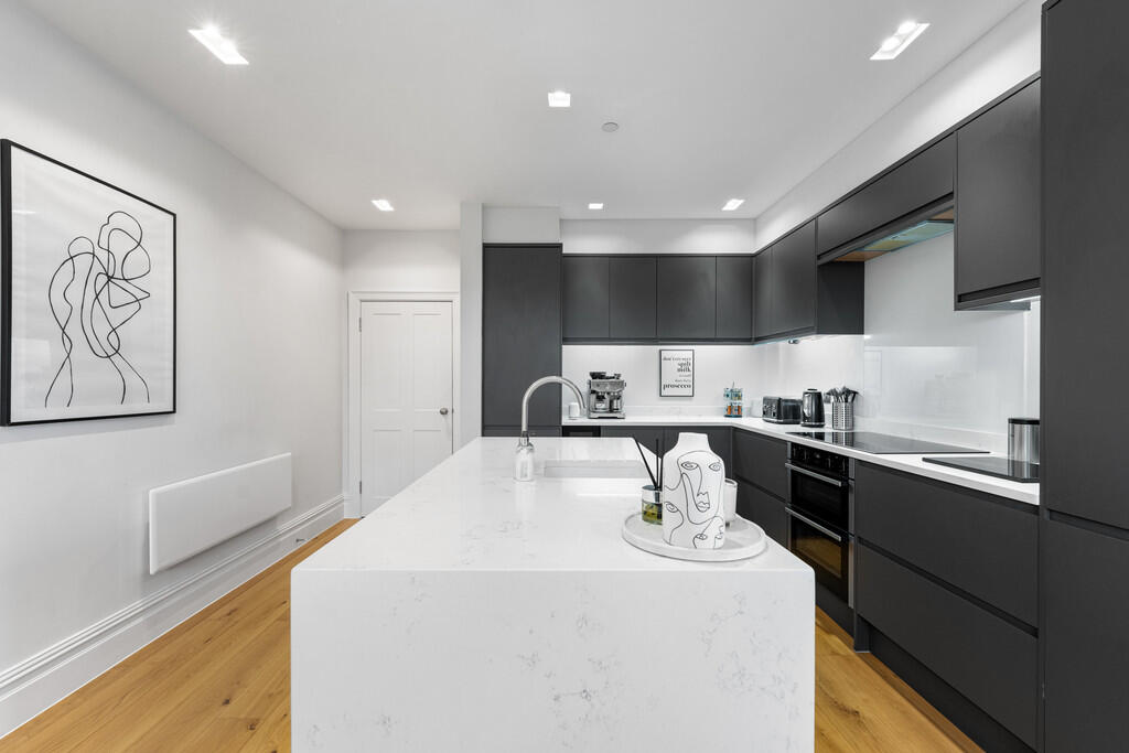 KITCHEN12' 11" x 10' 2" (3.94m x 3.11m) Fantastic open plan living. Large modern kitchen with engineered oak wood flooring. High specification wall and base units with 'Polished Quartz work surfaces. NEFF appliances throughout. Built in double oven and four ring electric hob with extractor hood over. Splash back. Integrated fridge freezer and wine cooler. Ample storage. Large breakfast island incorporating composite sink with drainer and dual tap. Storage below and integrated dishwasher. Extractor fan. Wall mounted electric panel heater. Spotlights to ceiling.