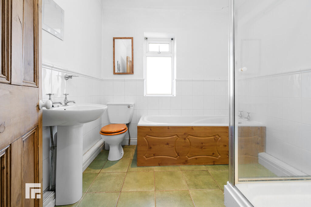 BATHROOM7' 5" x 6' 11" (2.27m x 2.12m) Vinyl flooring. Partially tiled walls. Pedestal wash hand basin with hot and cold tap over. WC. Panelled bath with hot and cold tap over. Walk in shower cubicle with mains powered shower over. Spotlights. Obscure double glazed window to rear aspect. Extractor fan.