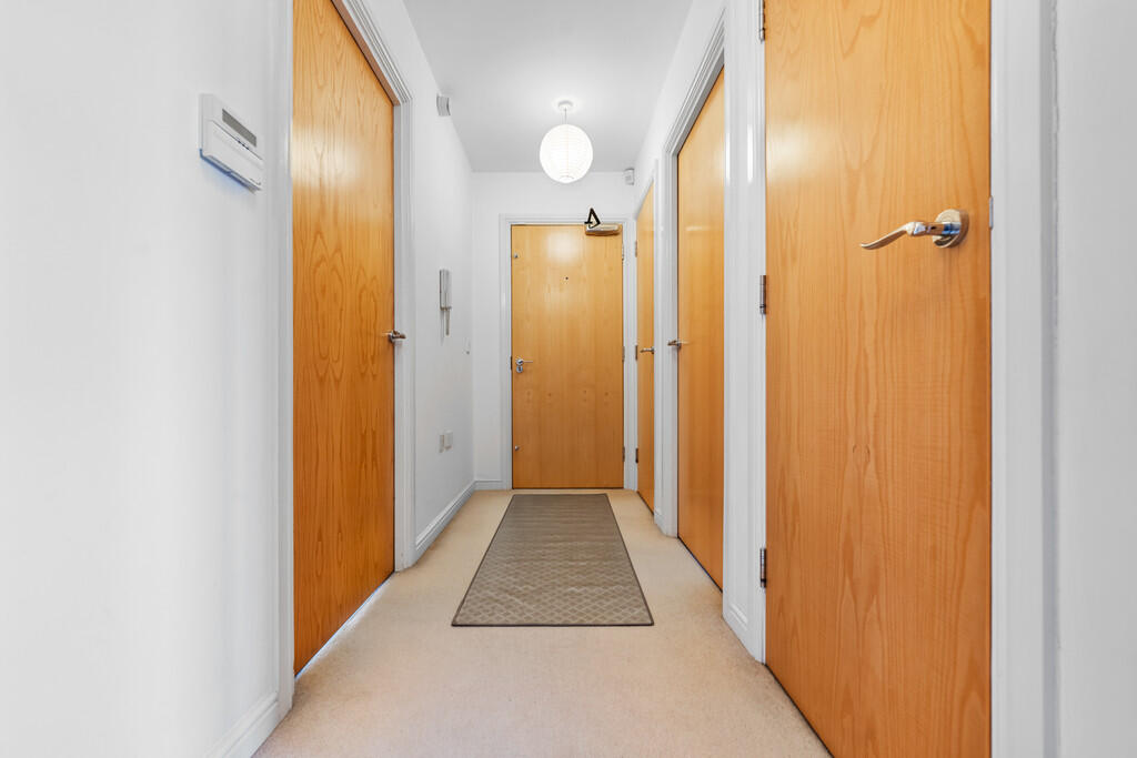 ENTRANCEHALL13' 6" x 4' 0" (4.12m x 1.22m) Entrance door with security spy hole. Wall mounted security entry intercom system. Carpeted flooring. Storage heater. Two storage cupboards, one housing hot water tank.