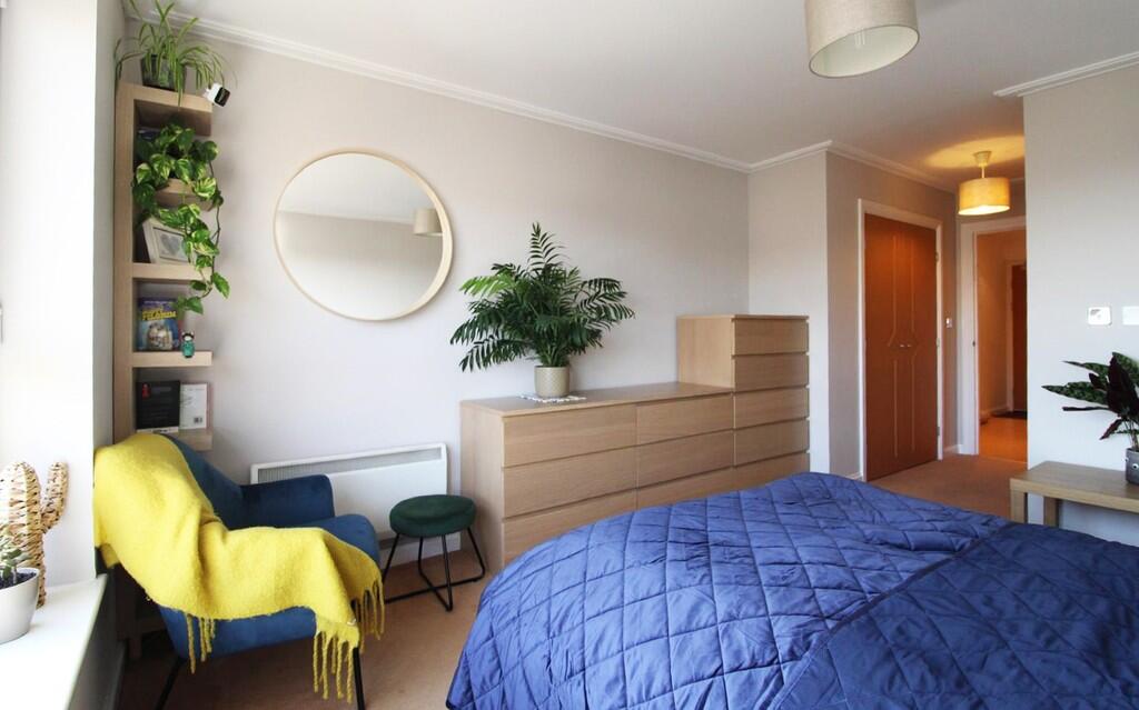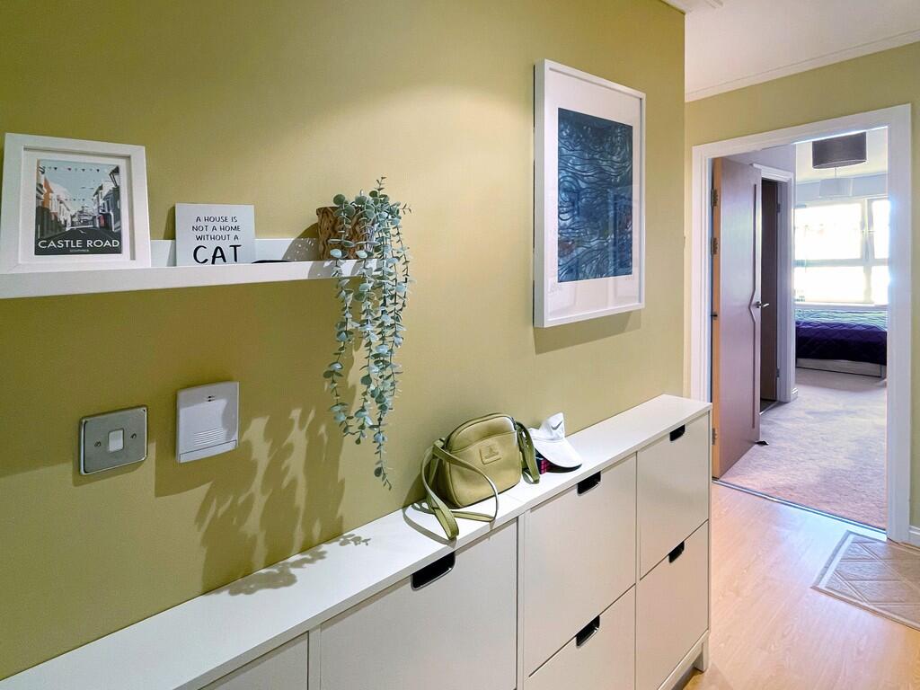 ENTRANCEHALL Entered via wooden front door with security spy hole, leading from communal hallway. Spacious entrance hall. Laminate wood effect flooring. Wall mounted video entry intercom system. Wall mounted EHC heat retention radiator. Storage cupboard, housing upgraded hot water tank. Additional storage cupboard/study. Spotlights. Coving to ceiling. Doors leading to all rooms.