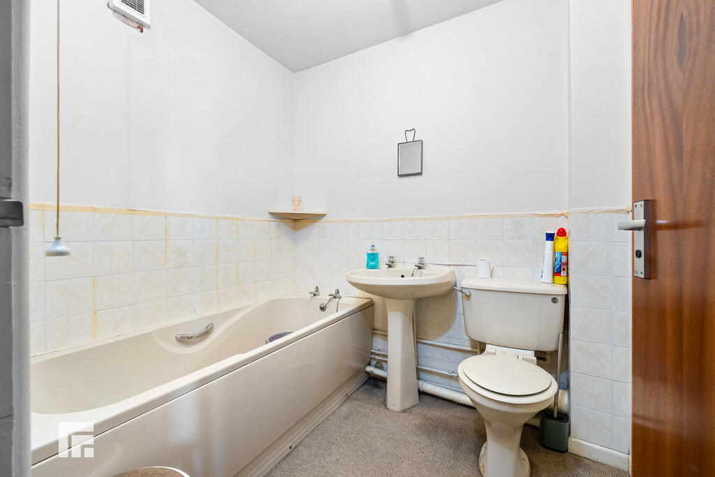 BATHROOM Carpeted flooring. Partially tiled walls. White three-piece-suite comprising WC, pedestal wash hand basin with hot and cold tap over and panelled bath with hot and cold tap over. Pendant light fitting. Extractor fan.