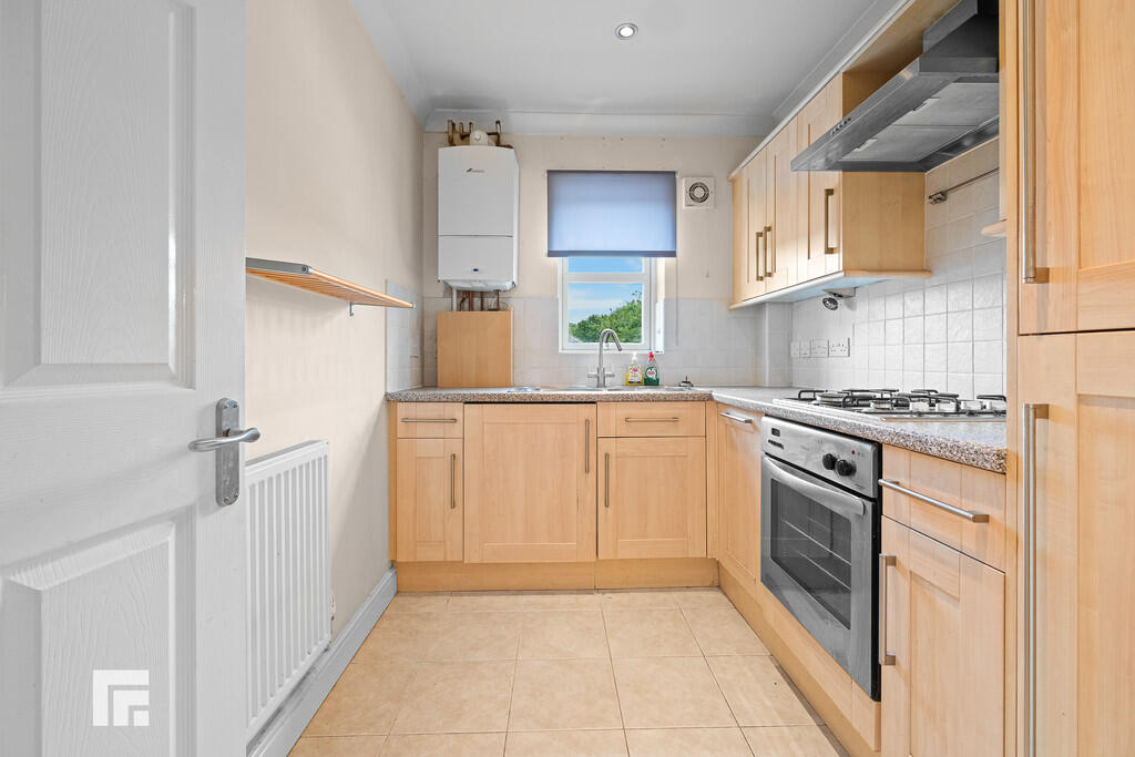 KITCHEN8' 5" x 6' 5" (2.59m x 1.97m) Separate kitchen. uPVC double glazed window to side. The kitchen is fitted with base and eye level units incorporating stainless steel sink and drainer with complementary work surfaces. Fitted electric oven with four ring gas hob and extractor hood over. Integrated fridge/freezer and washer/dryer. Tiled splash backs and flooring. Wall mounted gas central heating Combi boiler. Radiator. Extractor fan. Spotlights.