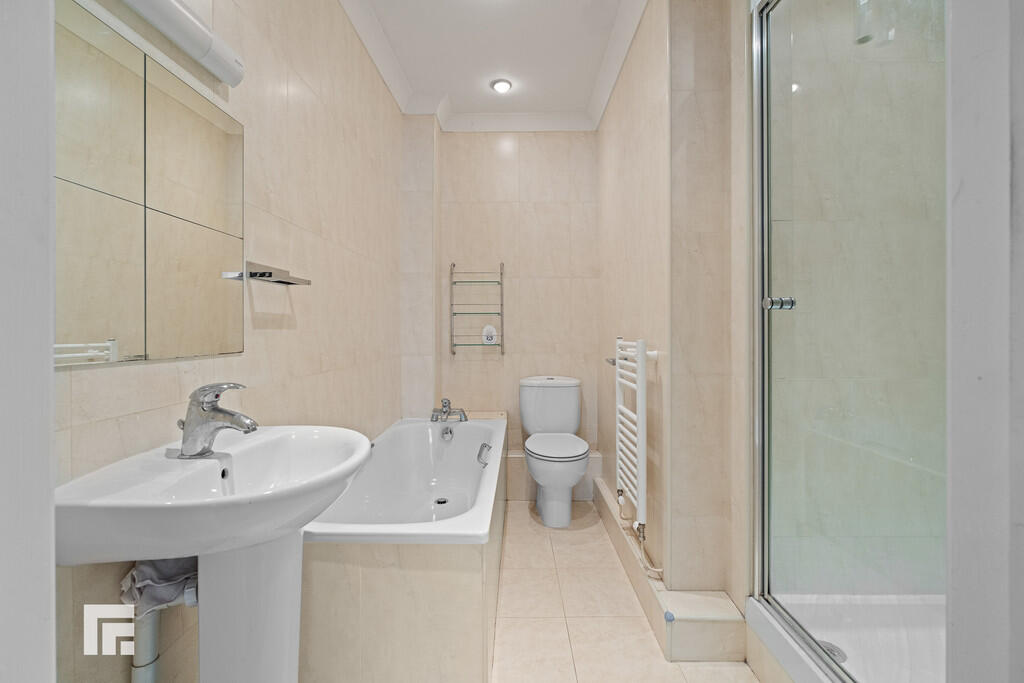 BATHROOM7' 4" x 6' 11" (2.25m x 2.13m) A three piece suite to include low level WC, pedestal wash hand basin, fitted shower cubicle with glass screen and panelled bath. Fully tiled walls and floor. Extractor fan. Ladder radiator.