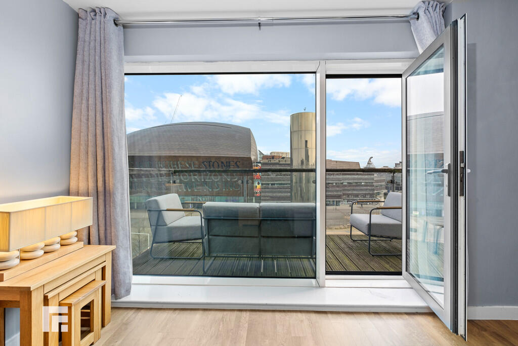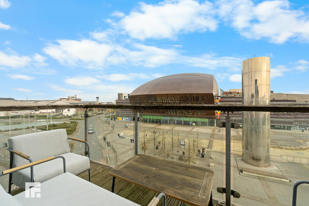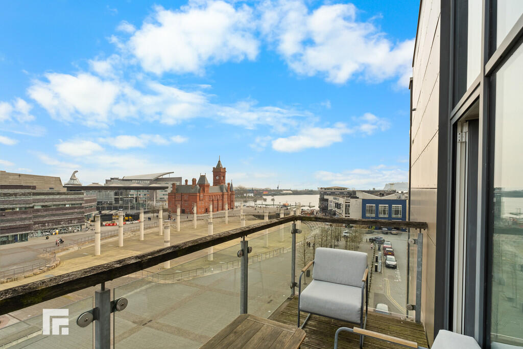 BALCONY Large decked balcony with fantastic views across Roald Dahl Plass and Cardiff Bay. Glass surround and external lighting. Accessed from the living room.