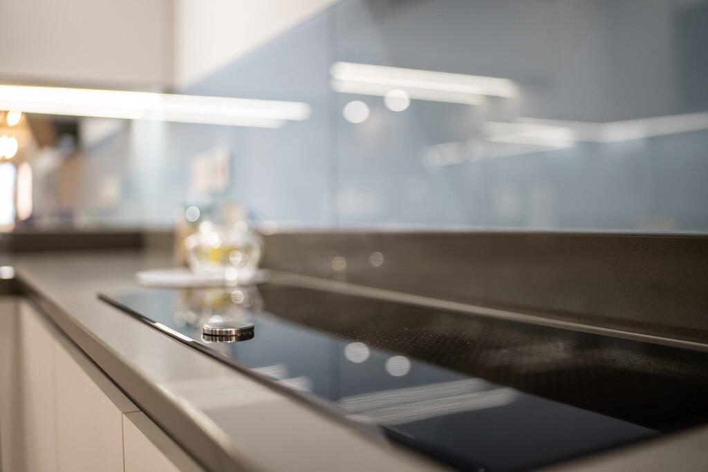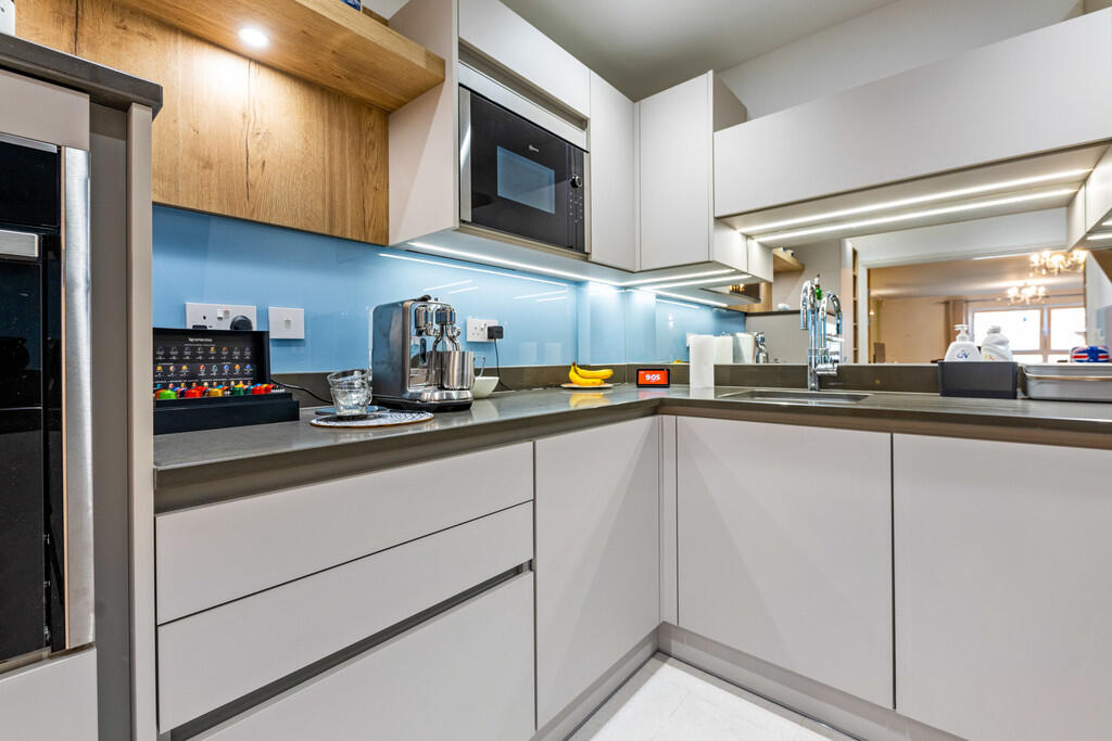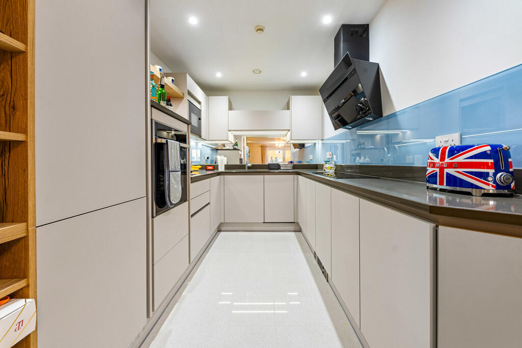 KITCHEN7' 4" x 11' 10" (2.25m x 3.63m) A lovely size well designed and appointed contemporary kitchen featuring a bespoke Sigma 3 kitchen. Wall and base units across three walls with contrasting Quartz work surfaces incorporating inset sink and drainer with Quooker mixer tap. Integrated fridge freezer and dishwasher. Integrated Neff microwave and extractor oven with hide and slide door. Induction hob above with glass splashbacks. Integrated Bosch washing machine and dryer. Fixed shelving above plus built in eye level glass splashbacks. Tiled flooring. Plinth heater. PowerPoints. Spotlights.