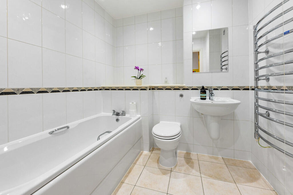 BATHROOM Spacious bathroom. Tiled flooring. Fully tiled walls. Wall mounted wash hand basin. Panelled bath, with hot and cold mixer tap over. W.C. Heated towel rail. Extractor fan. Spotlights.