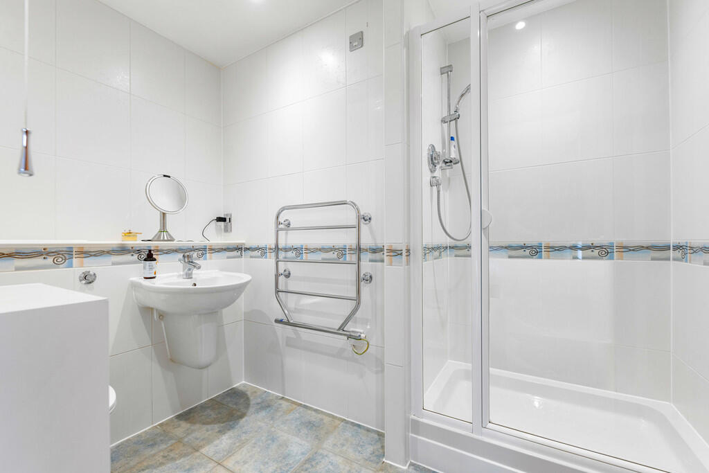 ENSUITE Large modern en-suite. Tiled flooring. Fully tiled walls. Walk in mains shower cubicle with glass doors. Wall mounted wash hand basin with mixer tap over. W.C. Shaver point. Heated towel rail. Extractor fan. Spotlights.