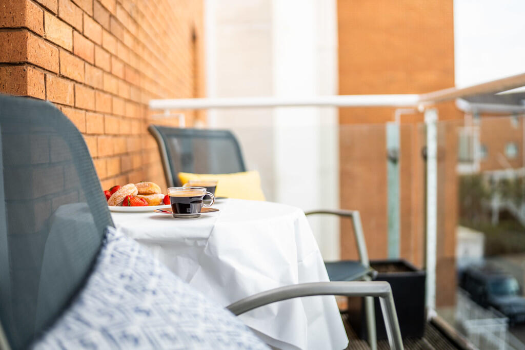 BALCONY Large decked private balcony, with glass surround. External lighting. Accessed from bedroom one overlooking the attractive gardens.