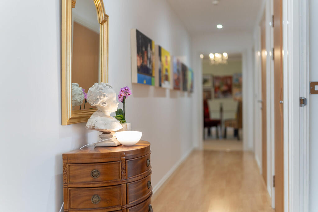 ENTRANCEHALL29' 11" x 3' 11" (9.14m x 1.21m) Entered via wooden door, with security spy hole. Laminate wood effect flooring. Two storage cupboards, one housing hot water tank. Double glazed floor to ceiling window to side aspect. Wall mounted electric storage heater. Wall mounted video entry intercom system. PowerPoints. Coving. Spotlights. Doors to all rooms.