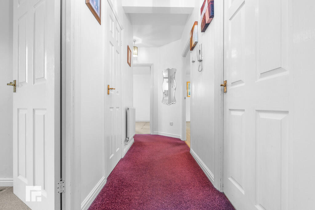 ENTRANCEHALL Entered via wooden door with security spy hole. Porch area with additional door leading to hall. Spacious hallway with doors leading to all rooms. Carpeted flooring. Two large storage cupboards. Wall mounted security entry intercom system. Wall mounted radiator.