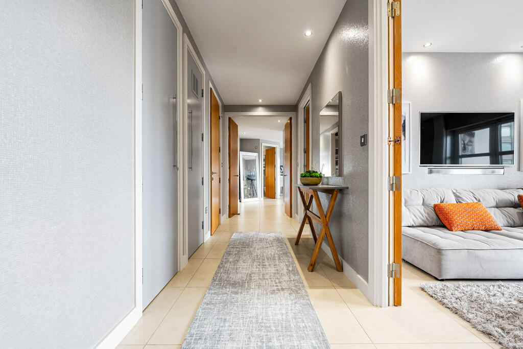 ENTRANCEHALL Entered via wooden door, with security spy hole. Tiled flooring. Video entry intercom system. Wall mounted electric panel heater. Three storage cupboards, one housing hot water tank and one with plumbing for washing machine. Spotlights.