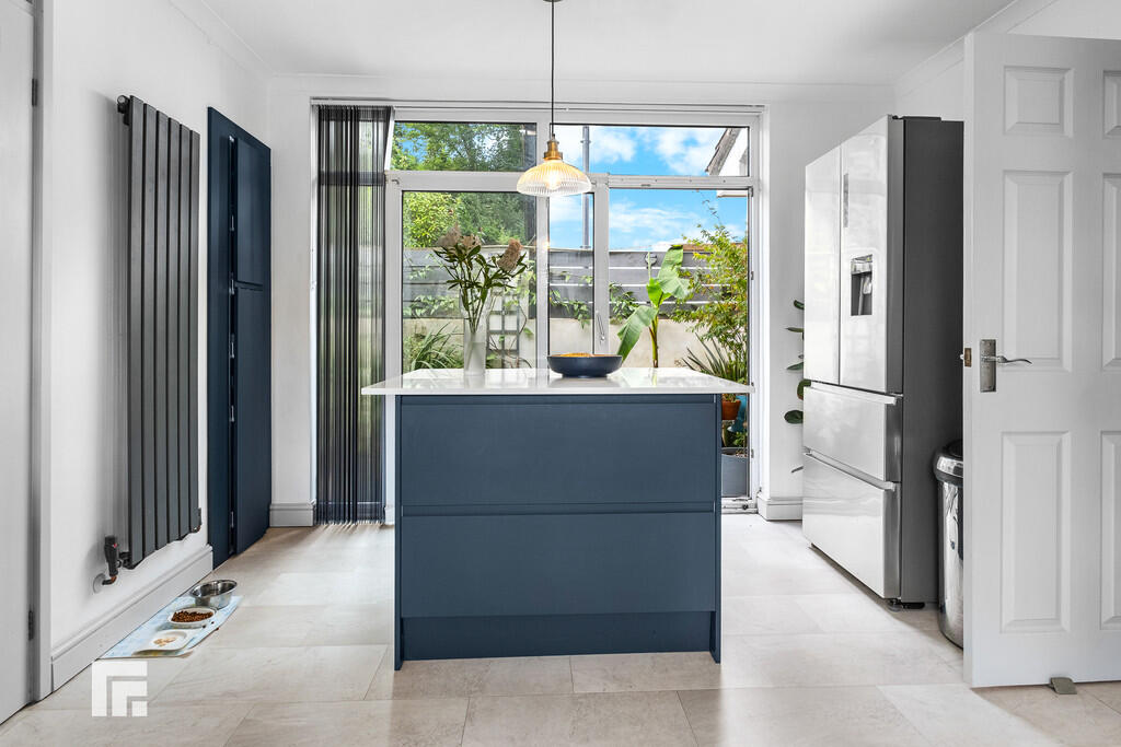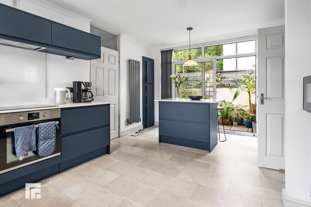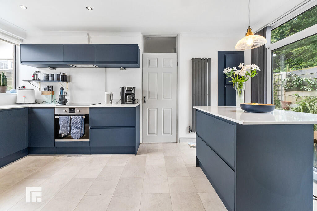 KITCHEN/BREAKFASTROOM15' 8" x 11' 5" (4.78m x 3.50m) A modern fitted Magnet kitchen appointed along three sides in 'Midnight Blue' handle less fronts beneath quartz worktop surfaces, inset sink with worktop side drainer, inset four ring hob with extractor fan above with integrated oven below, integrated washer dryer, integrated slim line dishwasher, matching range of eye level wall cupboards, quartz upstand splashback and quartz full splashback behind hob, inset pull out pantry storage cupboard, breakfast bar island with storage and quartz worktop, tilt and turn window/door to side, window and door to additional side leading to the side courtyard, quality Amtico flooring and modern vertical radiator. Door to inner hallway. Downlighting fitted.