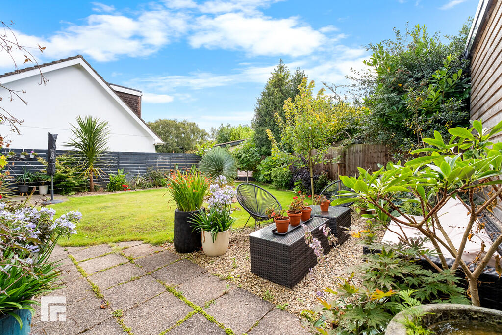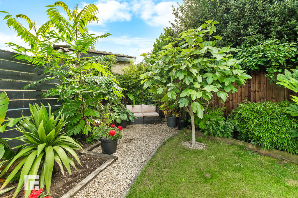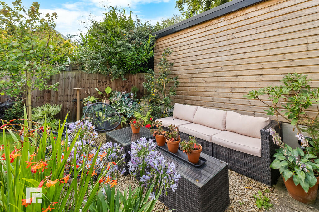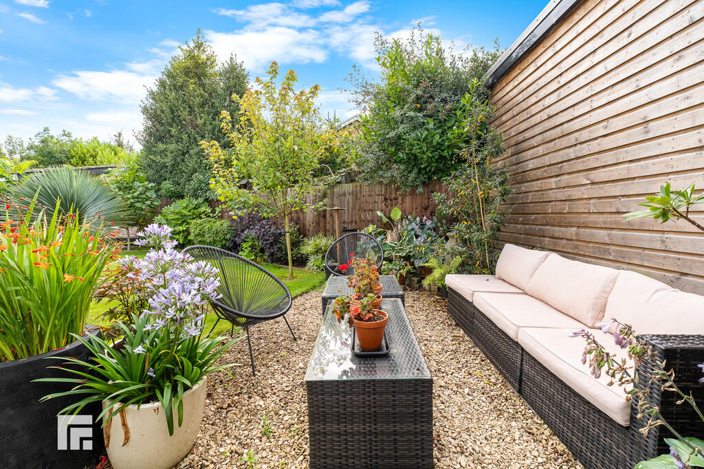 REARGARDEN Attractive rear garden comprising paved patio leading onto a shaped area of lawn, flower bed to one side, decorative stone patio and relaxation area. Two double outside power sockets.