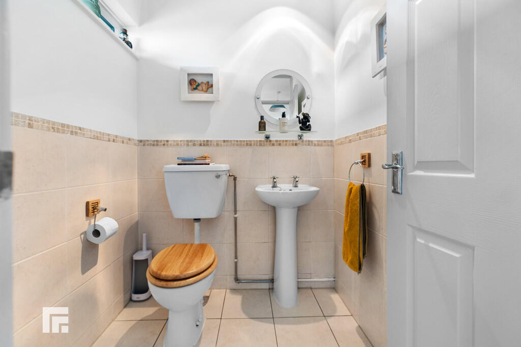 CLOAKROOM White suite comprising low level W.C, pedestal wash hand basin, tiled flooring, wall tiling to half height, window to front and chrome heated towel rail.