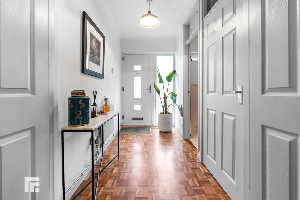 ENTRANCEHALLWAY Approached via a composite front door with double glazed windows to centre part, obscure double glazed window to side of front door, leading to the entrance hallway, wood flooring, large storage cupboard, radiator and double opening doors to dining room. Door to cloakroom.