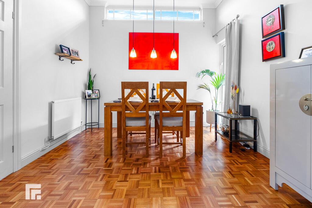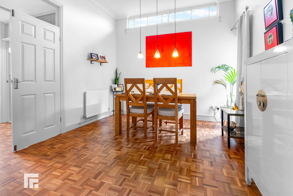 DININGROOM10' 9" x 10' 4" (3.28m x 3.16m) Ample space for large family dining table, window to side and window overlooking the side courtyard, wood flooring, radiator and opening to lounge.
