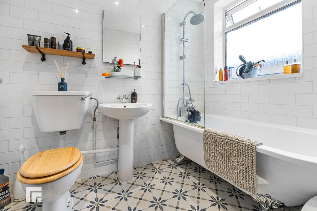 FAMILYBATHROOM7' 8" x 5' 8" (2.35m x 1.75m) White suite comprising low level W.C, wash hand basin, bath with shower mixer tap, full wall tiling, obscure glass window to side, recessed spotlights and heated towel rail.