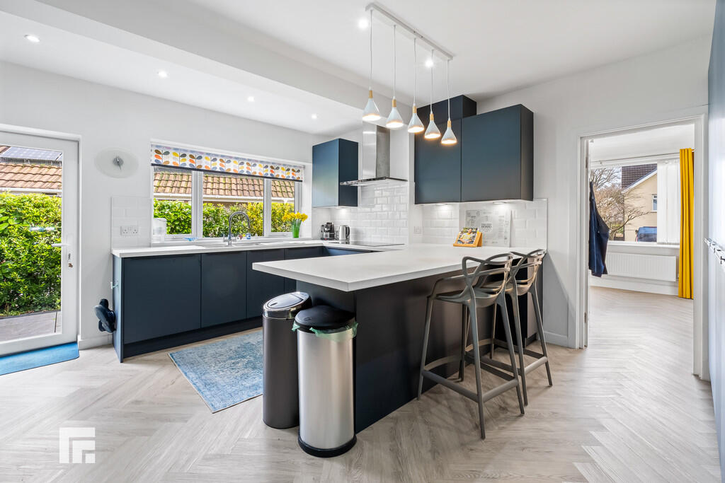 KITCHEN/BREAKFASTROOM14' 9" x 12' 8"(max) (4.51m x 3.88m) A beautifully presented, 'Leekes' kitchen, fitted with a wide range of base, eye level and larder units incorporating double bowl stainless steel sink and drainer with complementary work surfaces/breakfast bar. Fitted induction hob with extractor hood over. Two electric Neff ovens including microwave oven with plate warmer. Integrated Neff dishwasher and two fridge/freezers. Tiled splash backs. LVT (Luxury Vinyl Tile) flooring. Cupboard housing gas combination boiler. Spotlights. uPVC double glazed window and newly fitted external door to side. Door to dining room and opening to utility room.