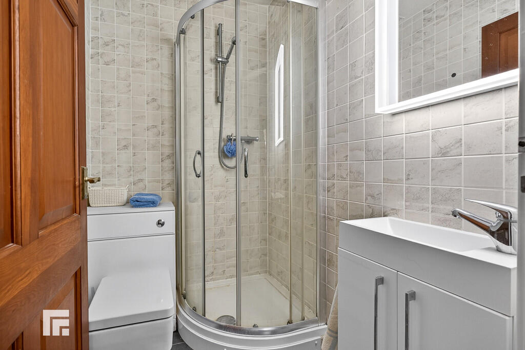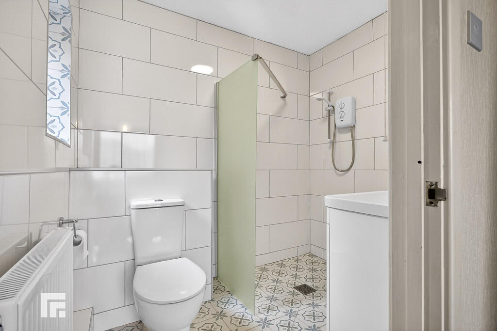ENSUITEWETROOM7' 5" x 5' 6" (2.28m x 1.7m) Modern white suite; low level WC, wash hand basin with chrome mixer tap and vanity. Shower with glass shower screen. Radiator. Tiled walls. Patterned tiled flooring. Obscured glass window to side.