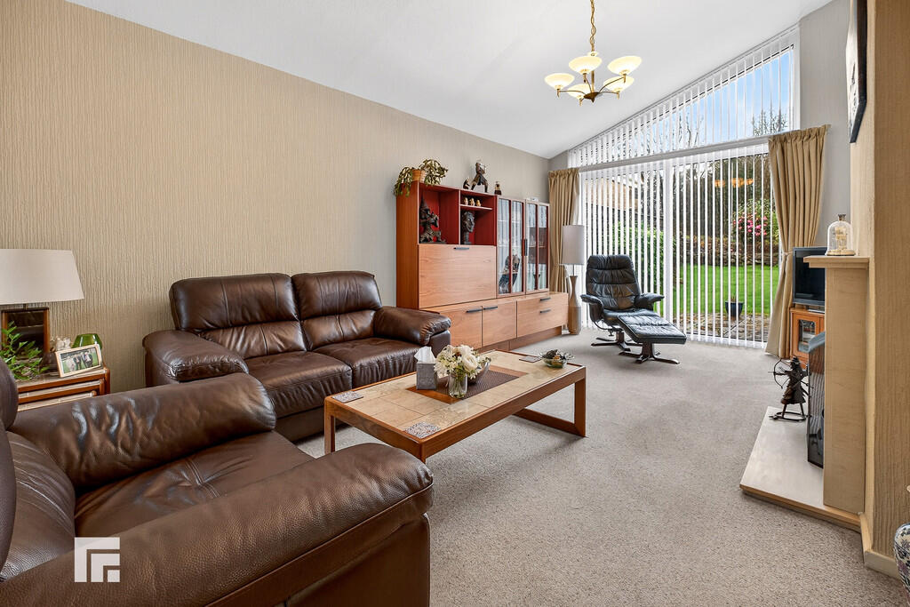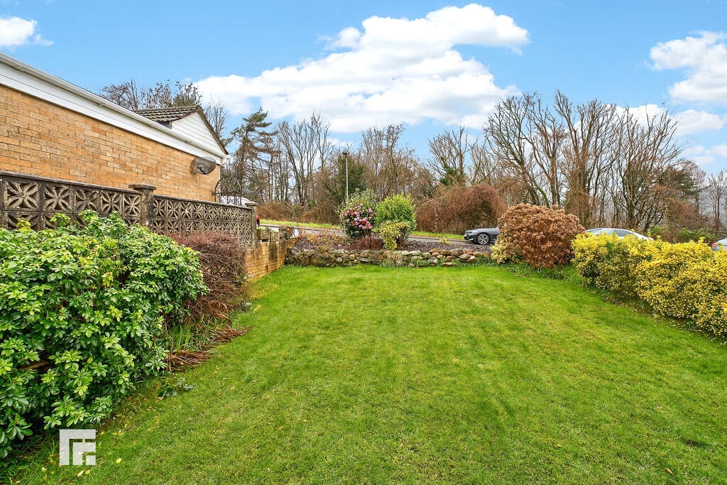 FRONTGARDEN With large area of lawn and neat borders or plants and shrubs. Side access. Long driveway leading to garage.