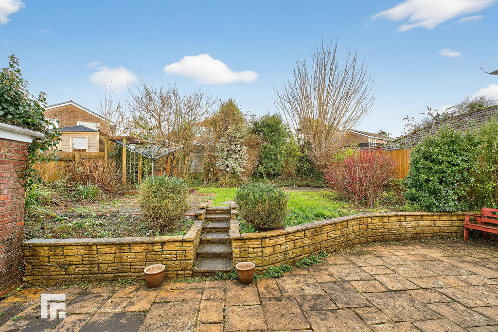 REARGARDEN Large paved patio with steps to an area of lawn with neat borders of plants and shrubs. Additional rear paved patio.