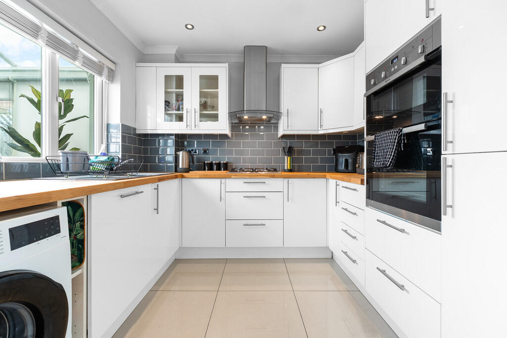 KITCHEN8' 9" x 8' 5" (2.69m x 2.59m) A modern 'Howdens' fitted kitchen well appointed along three sides in light high gloss fronts with chrome bar handles beneath solid Oak wood worktop surfaces. Inset 1.5 bowl stainless steel sink with side drainer. Inset 'Neff' four ring gas hob with curved glass cooker hood above. Integrated 'Neff' oven and grill. Integrated fridge freezer. Integrated 'Smeg' dishwasher. Plumbing for washing machine. Matching range of eye level wall cupboards. Tiled splashback. Window looking into the large conservatory. Tiled flooring.
