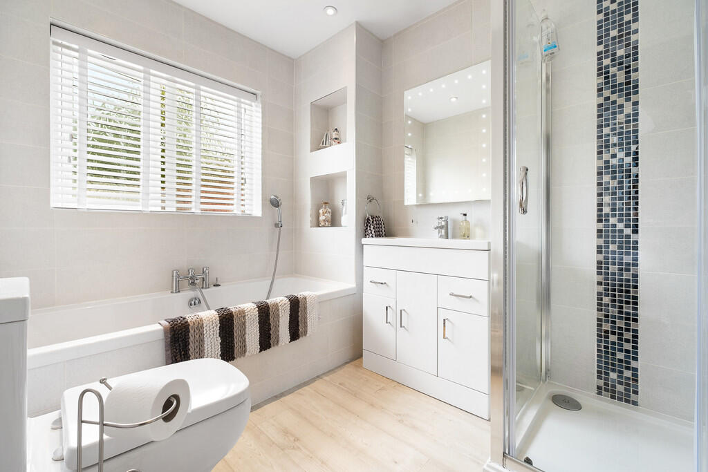 FAMILYBATH&SHOWERROOM9' 1" x 6' 6" (2.79m x 1.99m) A sizeable family bathroom with modern white suite comprising low level wc, vanity wash basin with storage below, large corner shower cubicle with 'Mira' shower and bath with central taps and shower mixer. Wall tiling to splash back areas. LVT flooring. Obscured glass window to rear. Recessed spotlights. Chrome heated towel rail.