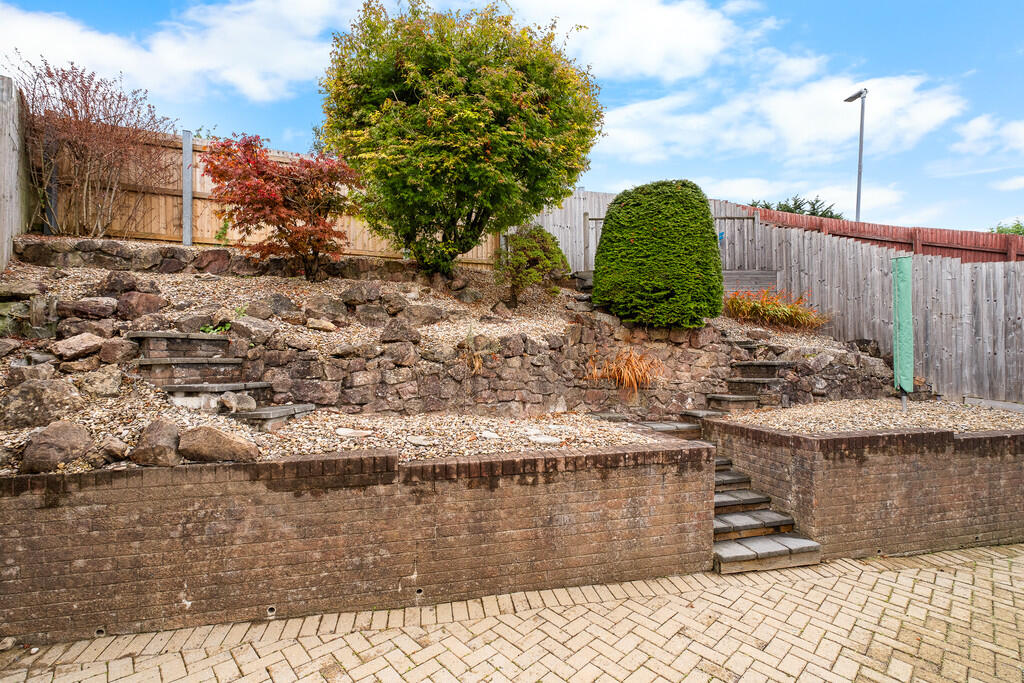 OUTSIDEREARGARDEN Key block paved patio leading onto a tiered garden of brick and stone walls with paved steps. Inset decorative stones and maturing trees. Upper tier with decked relaxation area. The garden is enclosed by timber fencing. Timber gate giving access to front.